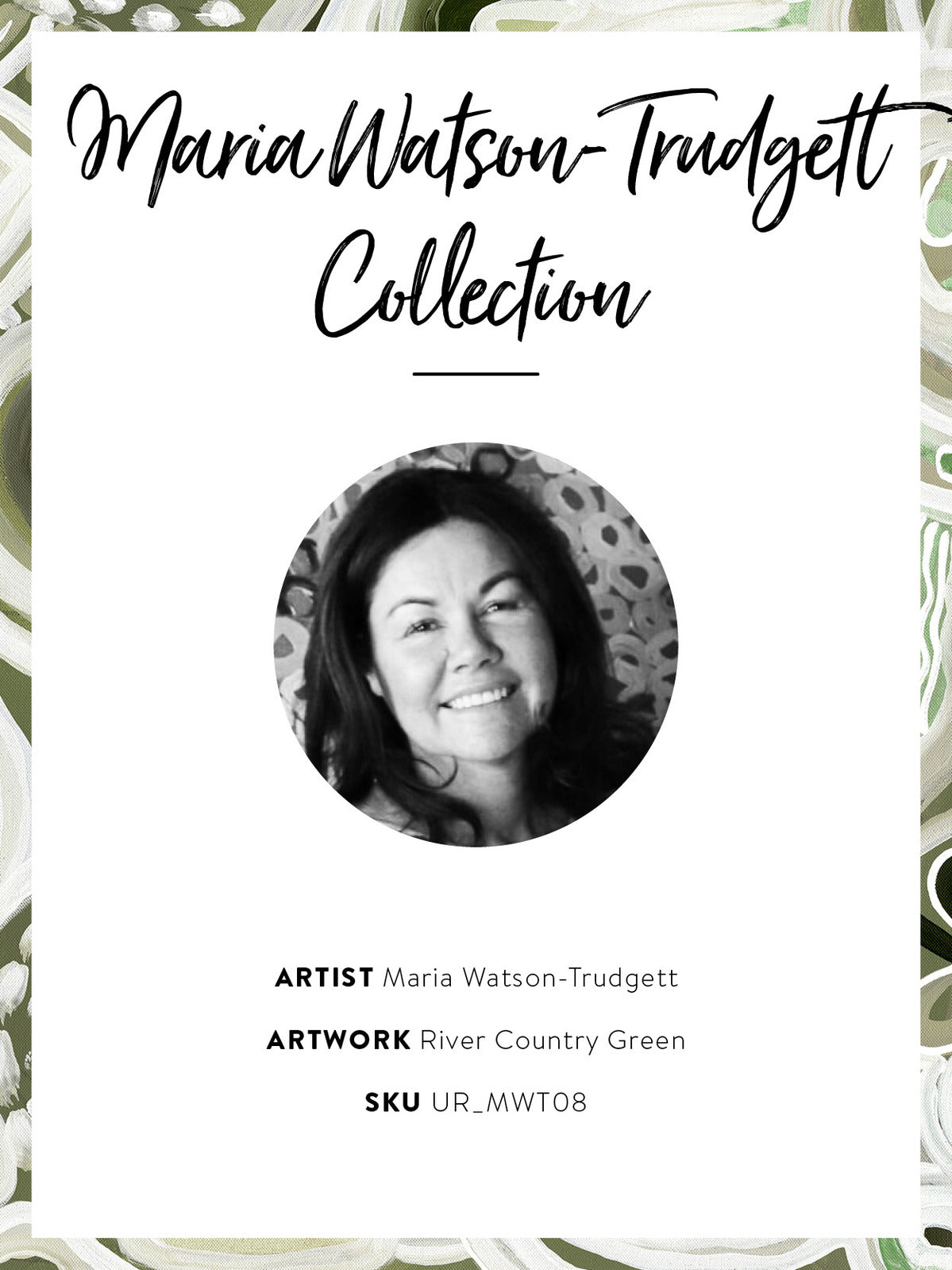 A rectangular button with a light brown background and white text that reads "DOWNLOAD ARTIST STORY," perfect for discovering the River Country Green Canvas Art Print by Maria Watson-Trudgett.