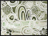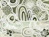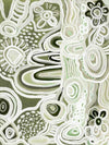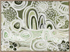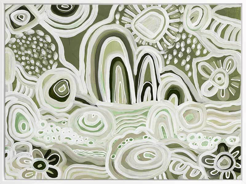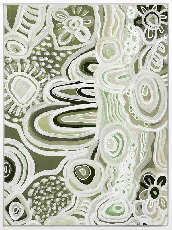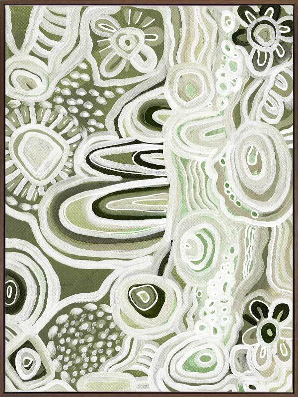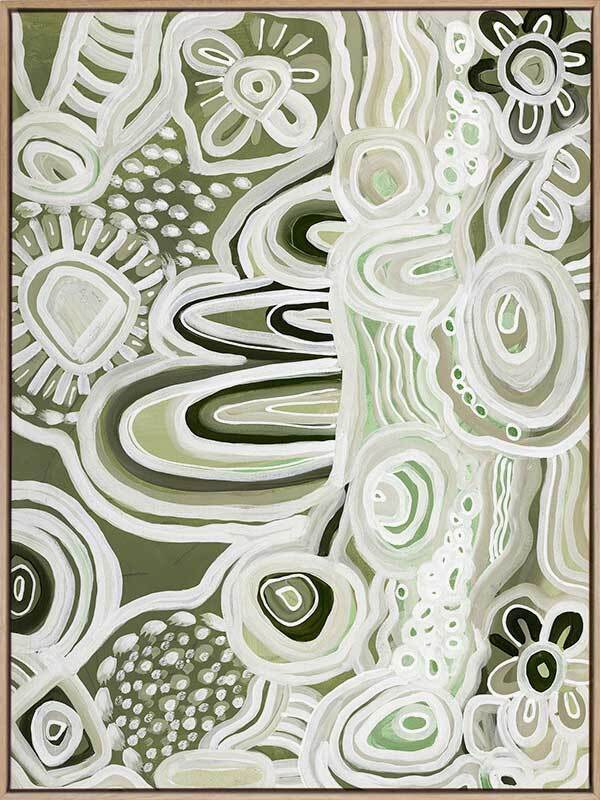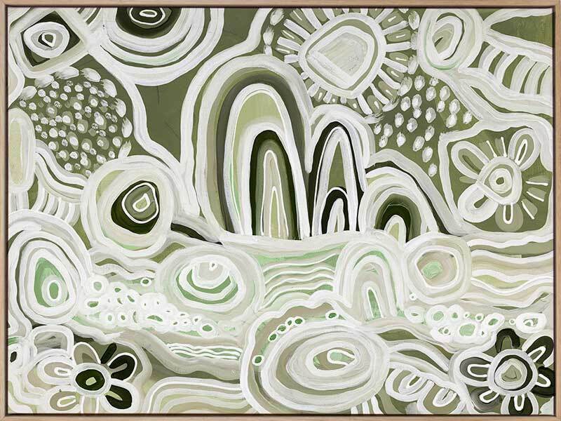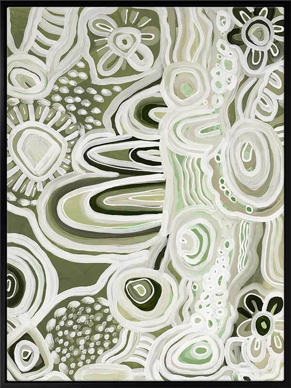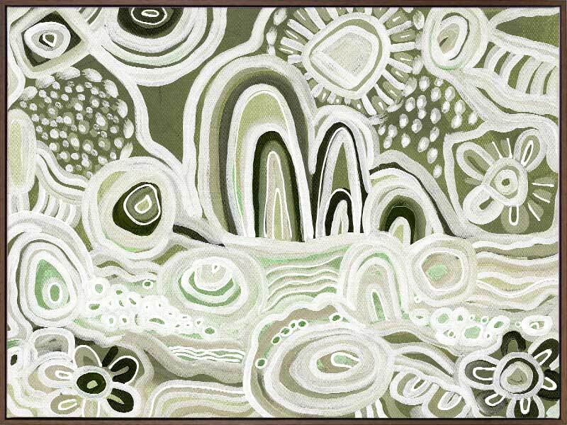 River Country Green Canvas Art Print - An abstract take on a landscape, this Indigenous Aboriginal artwork shows rolling green hills among a field of flora and fauna. A river flows along the centre, underneath the warm rays of the sun. Such an organic placement of lines and dots portrays the constant movement of nature itself. A monotone palette moves from dark to light green, making this a versatile piece.