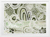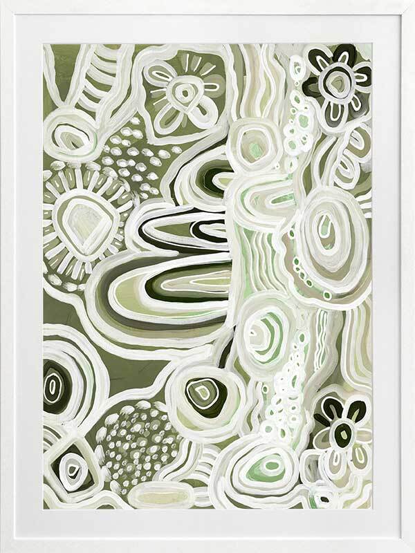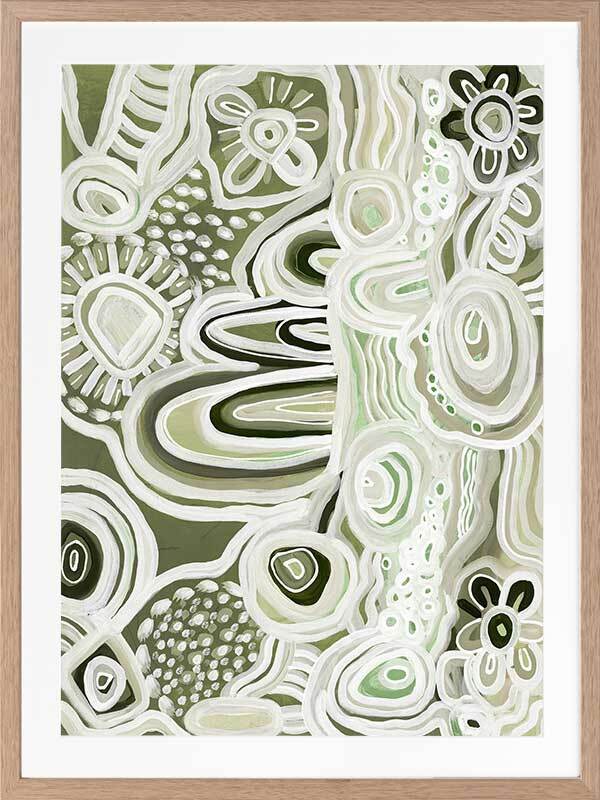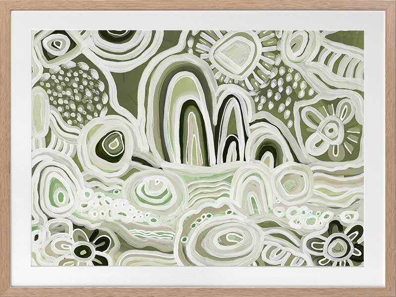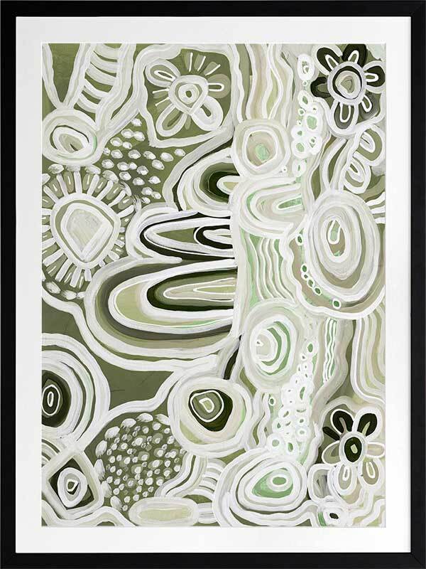 River Country Green Framed Art Print - An abstract take on a landscape, this Indigenous Aboriginal artwork shows rolling green hills among a field of flora and fauna. A river flows along the centre, underneath the warm rays of the sun. Such an organic placement of lines and dots portrays the constant movement of nature itself. A monotone palette moves from dark to light green, making this a versatile piece.