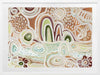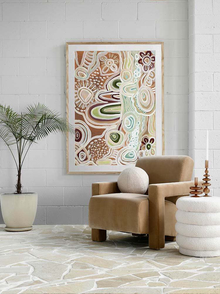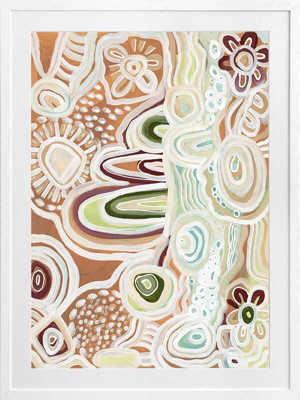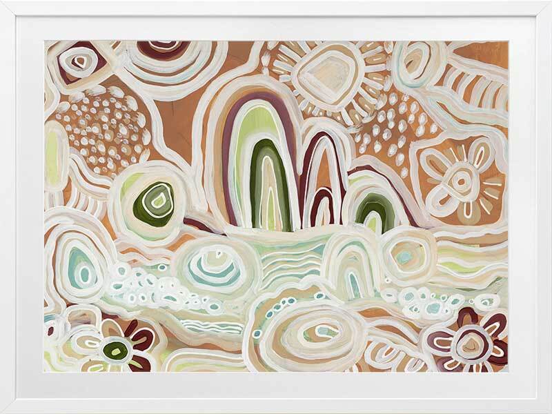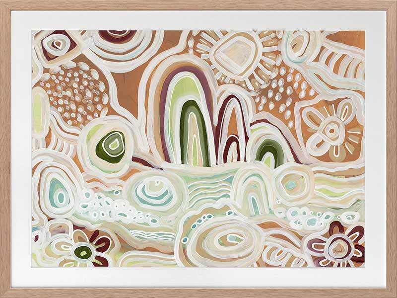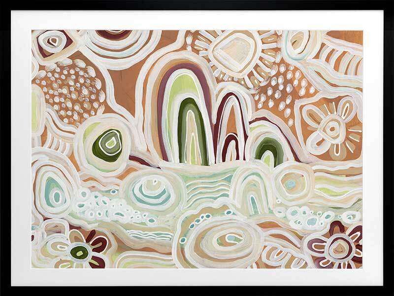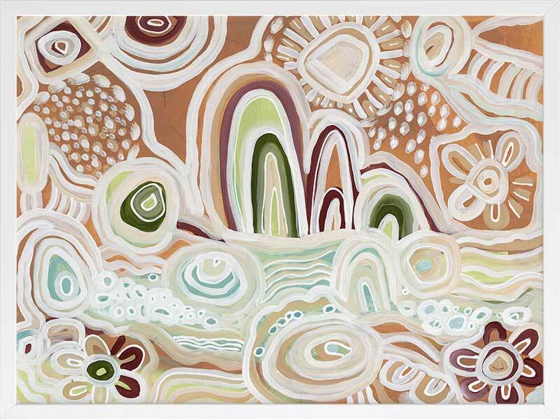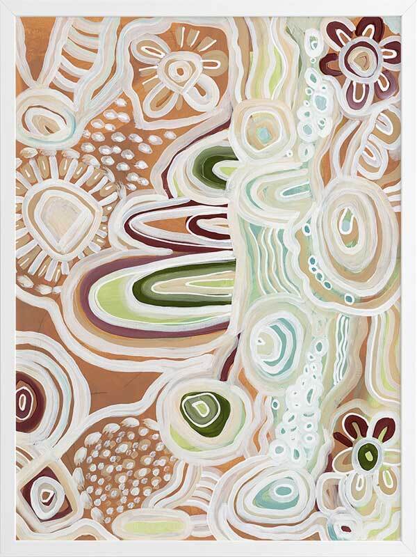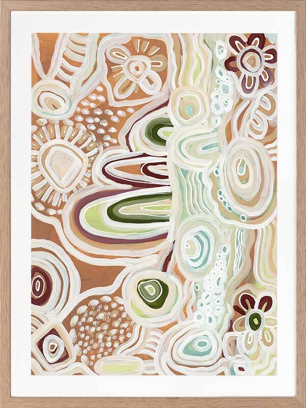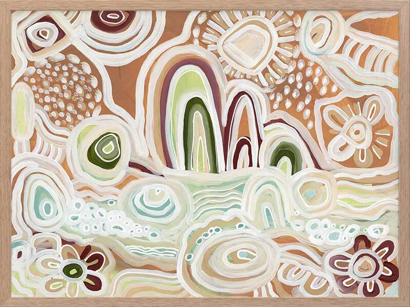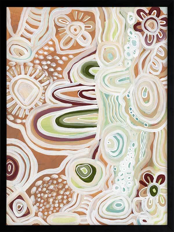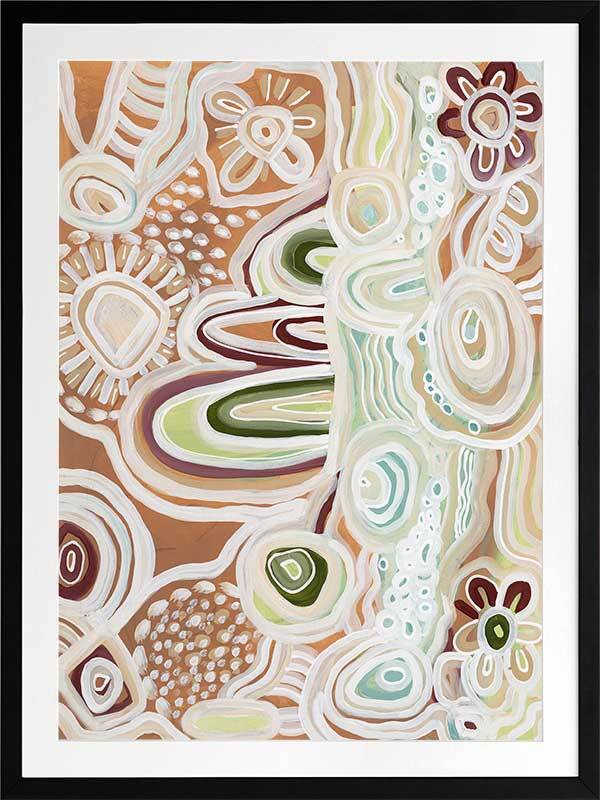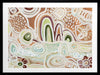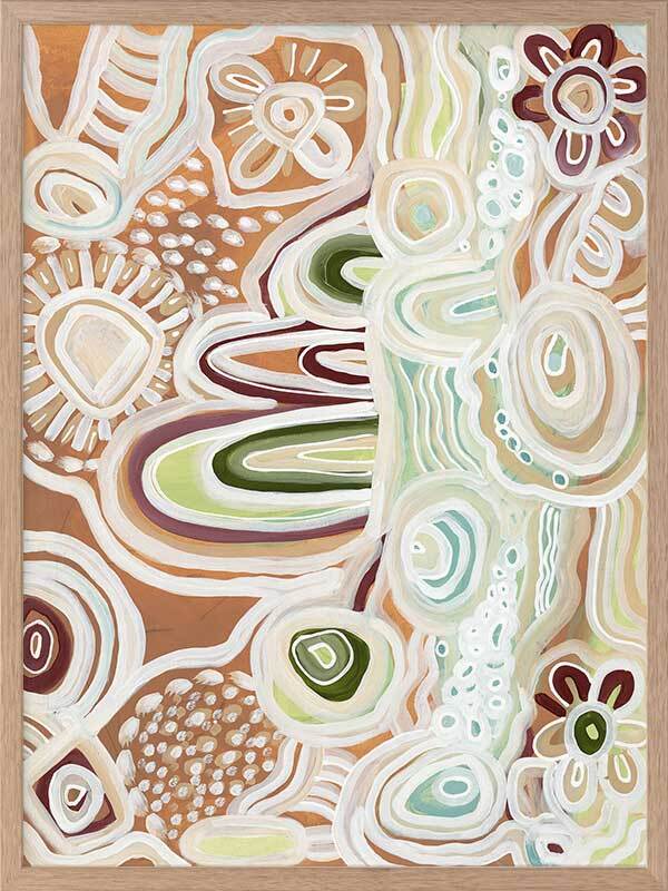 River Country Tan Framed Art Print - An abstract take on a landscape, this Indigenous Aboriginal artwork shows rolling hills among a field of flora and fauna. A river flows along the centre, underneath the warm rays of the sun. Such an organic placement of lines and dots portrays the constant movement of nature itself. Greens and blues stand out amongst the warm orange, purple and red tones.