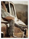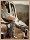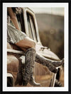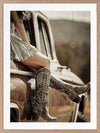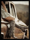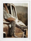 Road Trip Framed Art Print - Evoking a sense of adventure and freedom, this photographic artwork captures the essence of the modern American Southwest. A pair of cowboy boots, resting against a vintage car, transport you to a bygone era. The warm, sepia tones and retro styling create a nostalgic appeal. Perfect for adding a touch of rugged charm to your living room or bedroom, this wall art celebrates the allure of the 20th-century Americana.