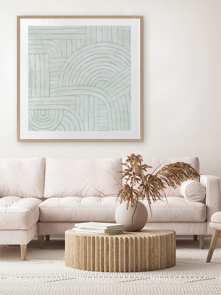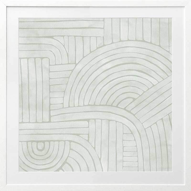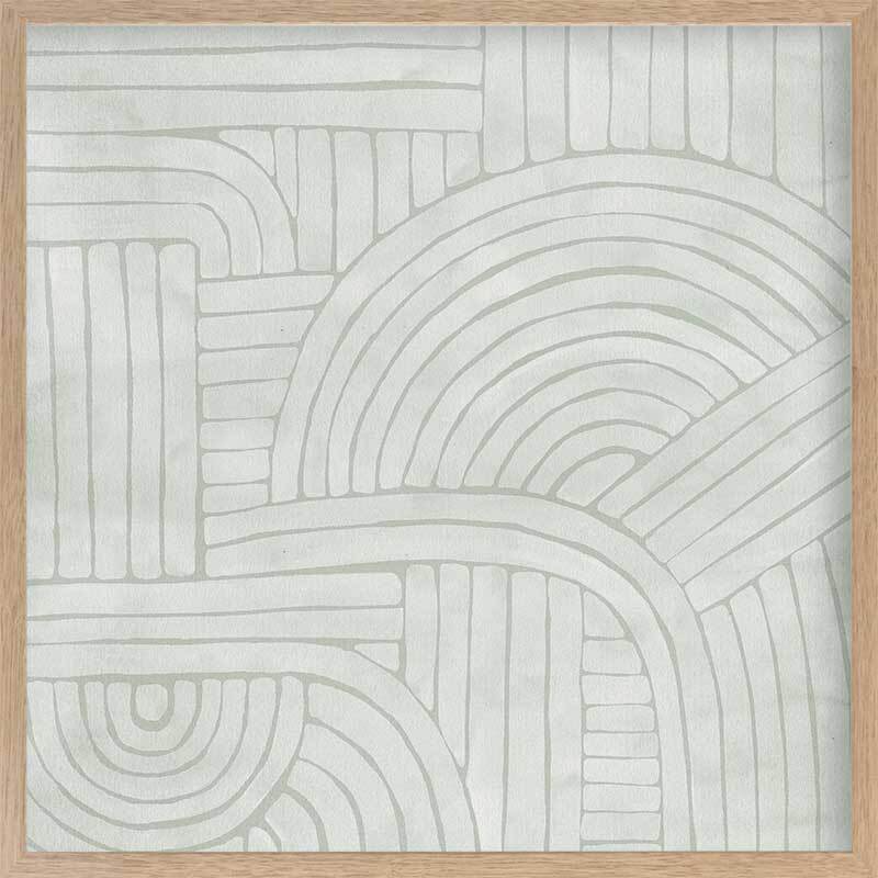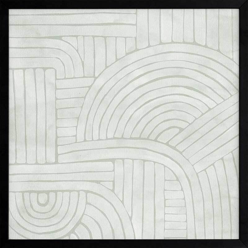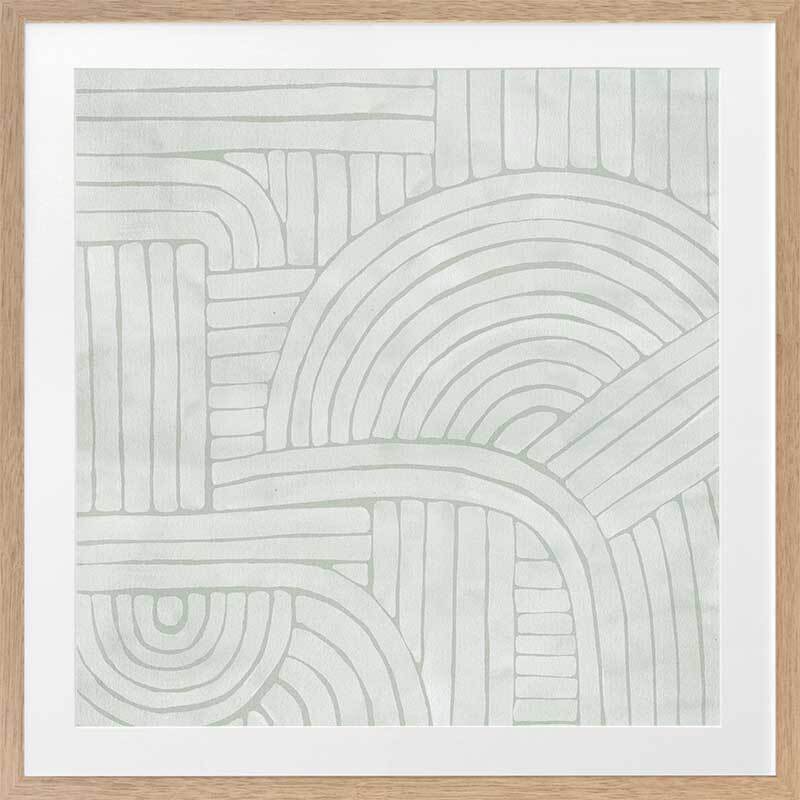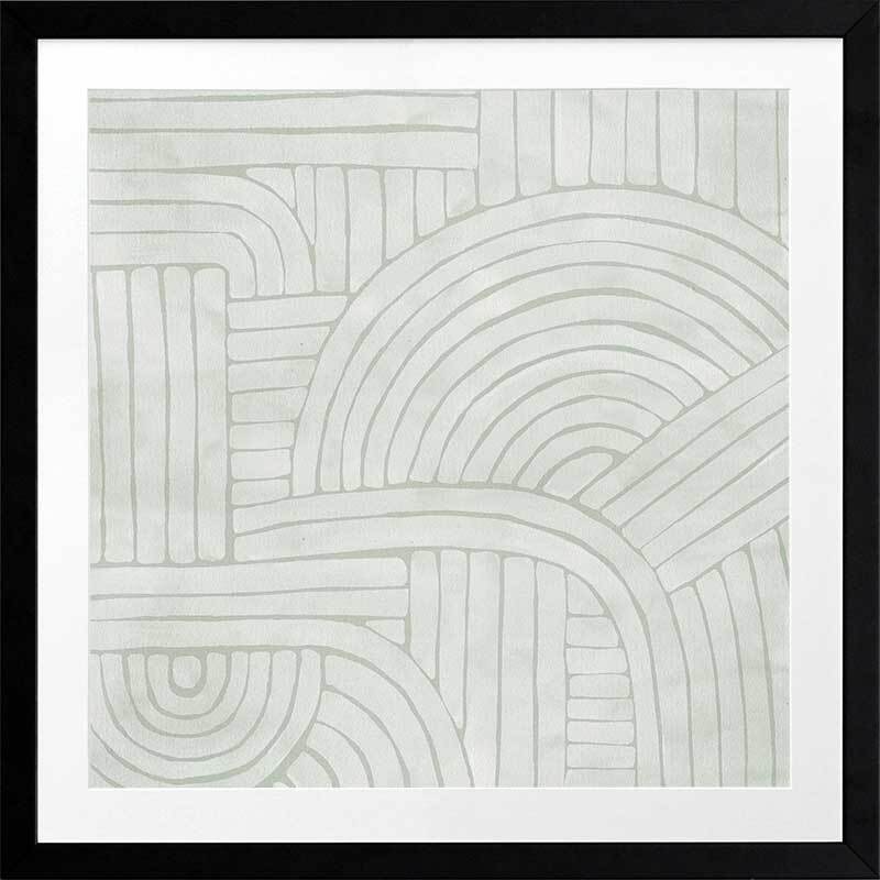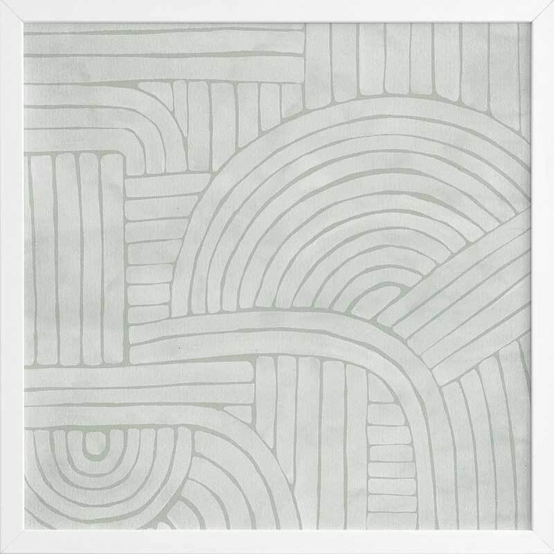 Roaming III Framed Art Print - Modern art lovers are sure to fall in love with this geometric-inspired abstract piece. A pastel green background makes a soft contrast with the light, almost white-green tones. Curved and straight lines meet in an interlocking effect, evoking a sense of flow and movement.