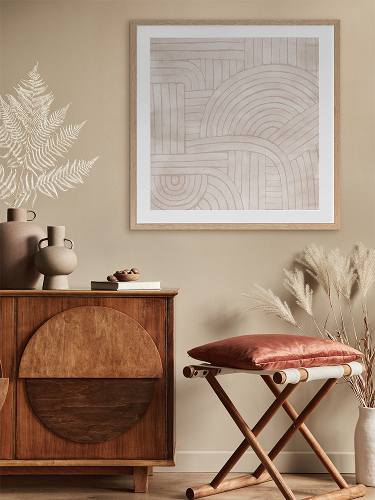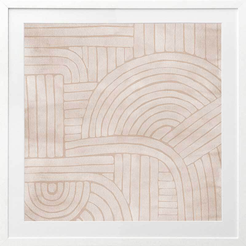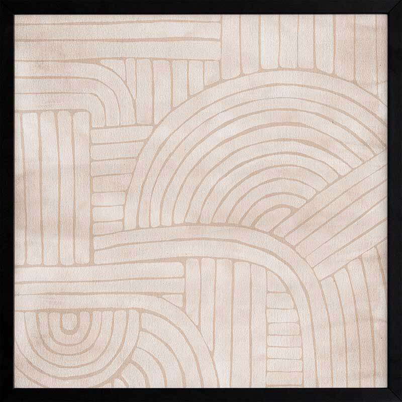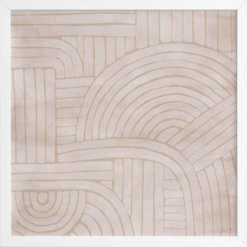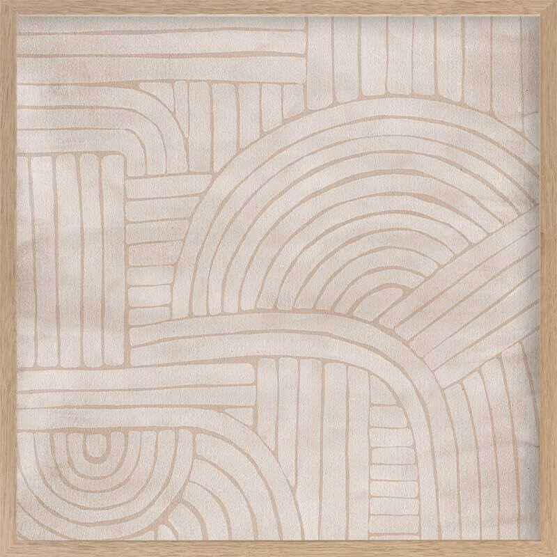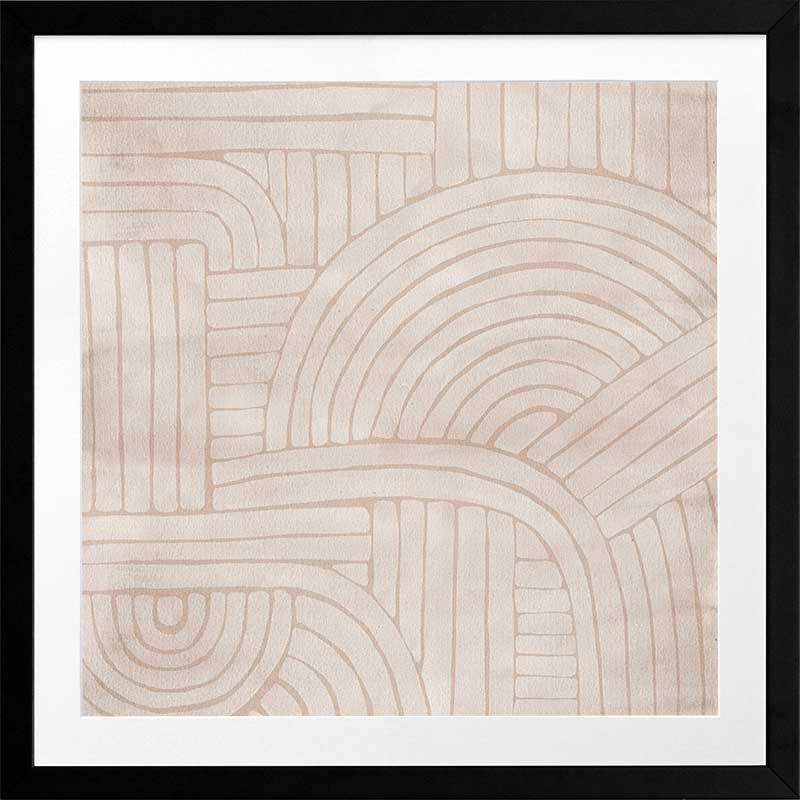 Roaming IV Framed Art Print - Modern art lovers are sure to fall in love with this geometric-inspired abstract piece. A soft, tan coloured background makes a soft contrast with the lighter tones at the foreground. Curved and straight lines meet in an interlocking effect, evoking a sense of flow and movement.