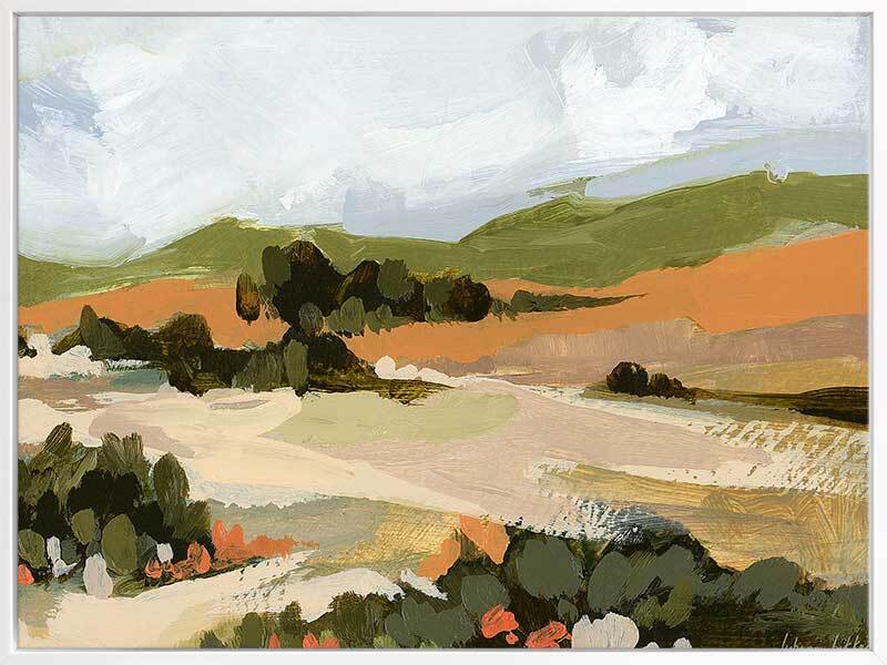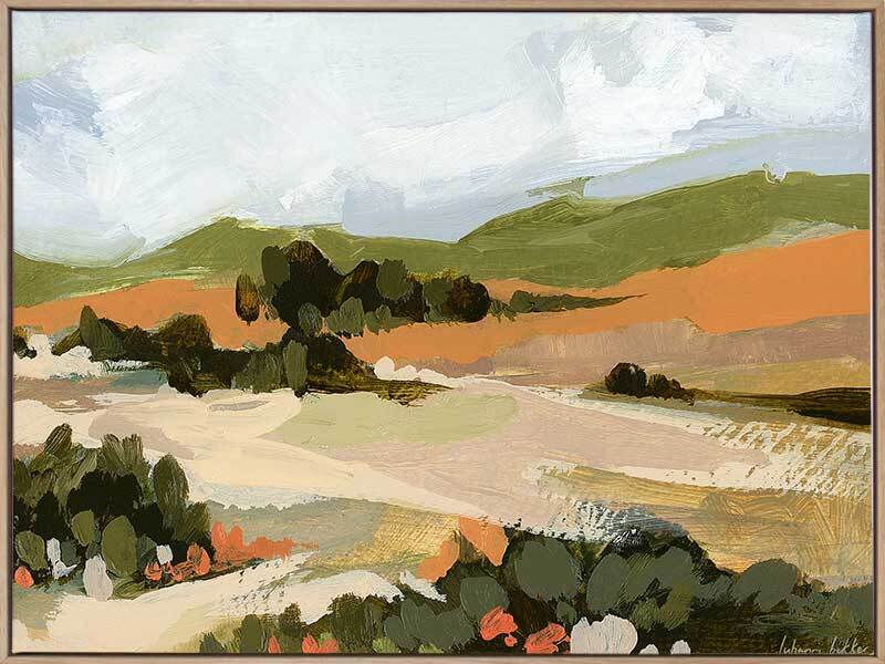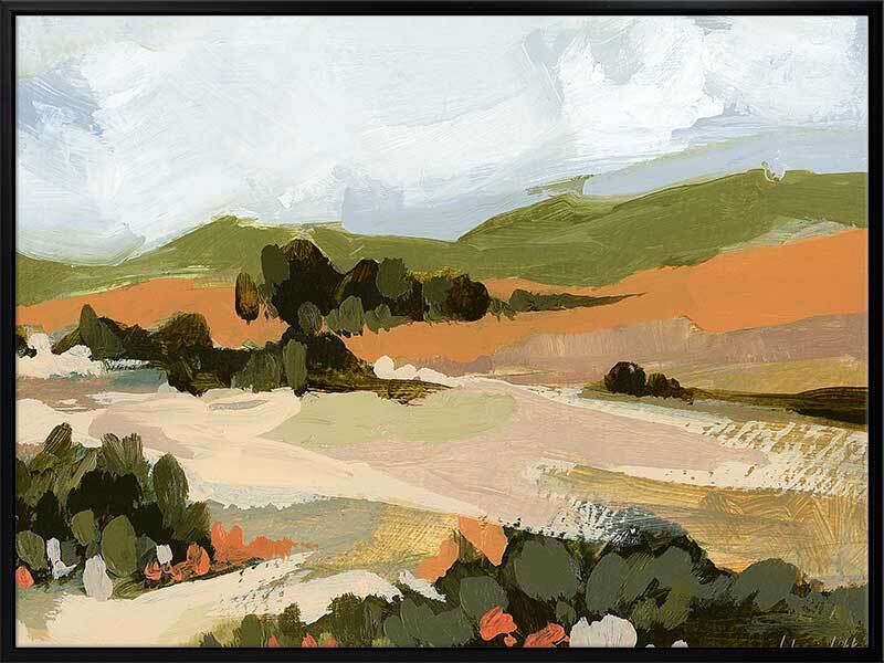 Rolling Hills I Canvas Art Print - With its uplifting use of warm orange, khaki green, and soft blue colours, this piece is a delight and perfect for subtly brightening up any space. Visible brush strokes give it a painterly feel, capturing the movement of some distant rolling hills.