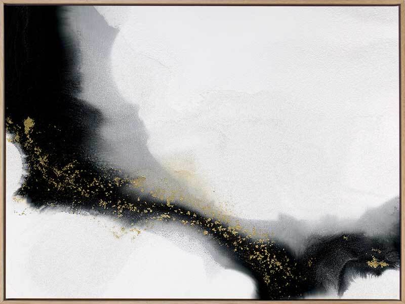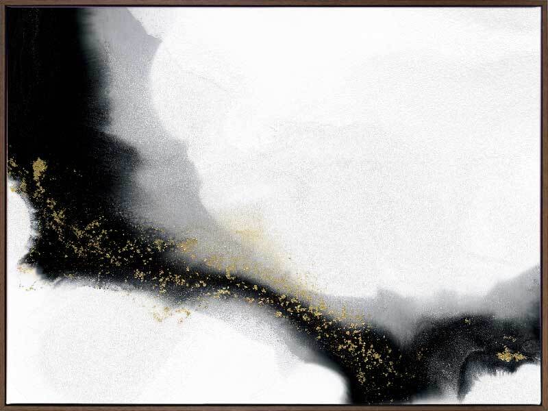 Rorshach I Canvas Art Print - A soft, minimal abstract piece featuring a blend of soft grey and white contrasted with a deep, inky black stroke and accented with flecks of gold. Pairs with Rorshach II.