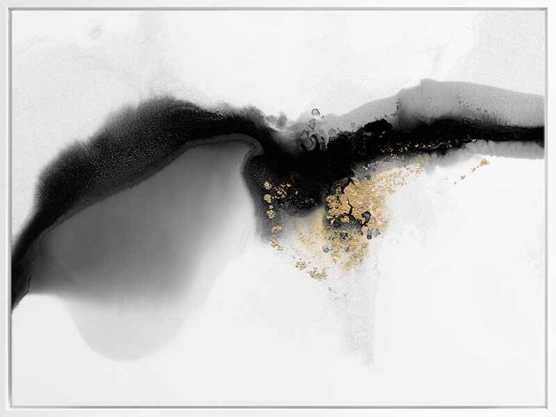 Rorshach II Canvas Art Print - A soft, minimal abstract piece featuring a blend of soft grey and white contrasted with a deep, inky black stroke and accented with flecks of gold. Pairs with Rorshach I.