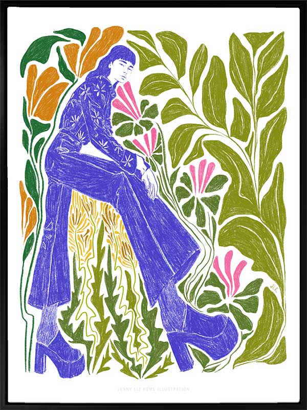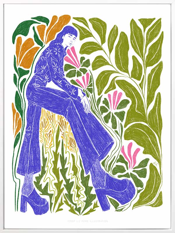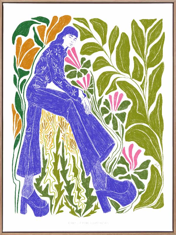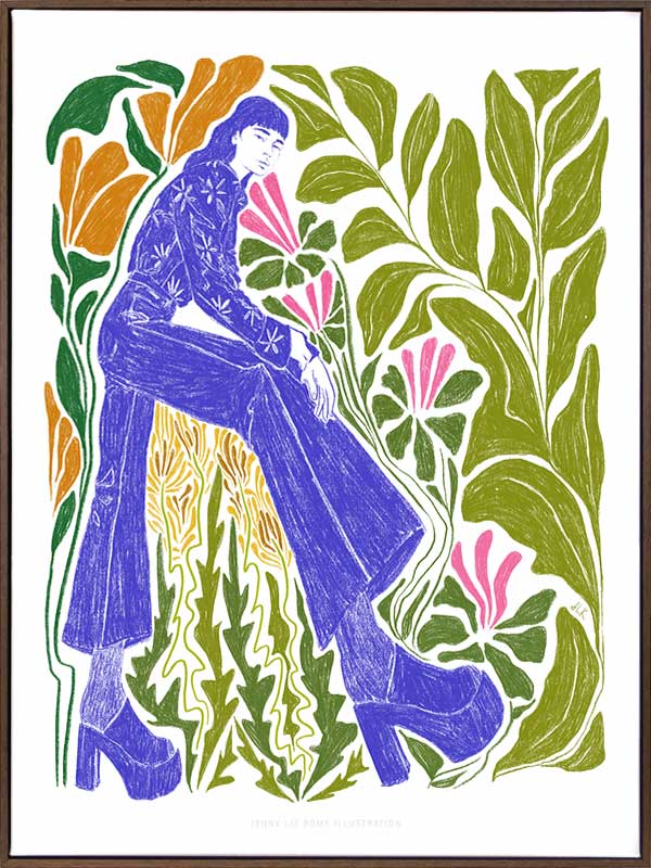 Rosalie Canvas Art Print - This bold retro poster art print by Jenny Liz Rome celebrates vintage fashion with a bohemian twist. Featuring a striking woman wearing blue denim against a lush botanical backdrop, this artwork brings a unique blend of nostalgia and modern flair. A perfect choice for those who love boho style wall art, this piece complements eclectic interiors, making it a standout addition to any space. This piece effortlessly merges pinup artwork influences with contemporary cool artwork prints, offering a timeless yet trend-forward aesthetic.