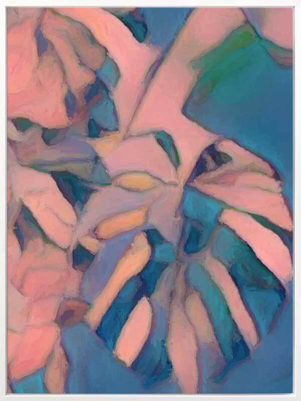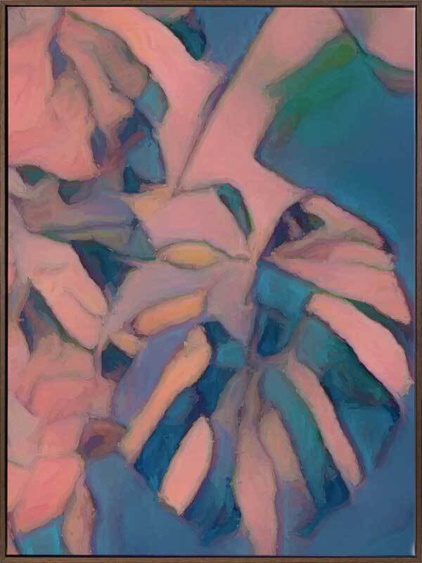 Rose Coloured Glasses II Canvas Art Print: A vibrant artwork that features monstera leaves in a kaleidoscope of jewel tones - blue, green and pink. Pairs with Rose Coloured Glasses I. 2019 AUTUMN/WINTER COLLECTION: ODYSSEY