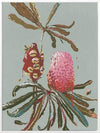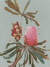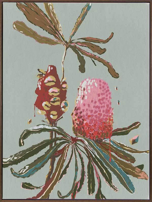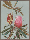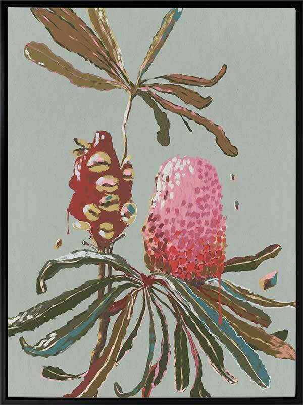 Sage Banksia Canvas Art Print - Soft and feminine, this earthy, Australiana-themed artwork features a textured, painterly style banksia branch - including a blooming banksia, alongside a seed pod. The colour palette is delicate yet impactful, featuring a pink and red banksia contrasted against a gentle sage green background. Pairs with Sage Waratah.