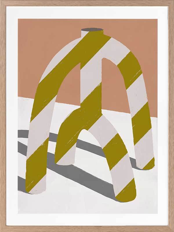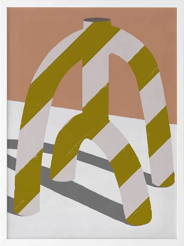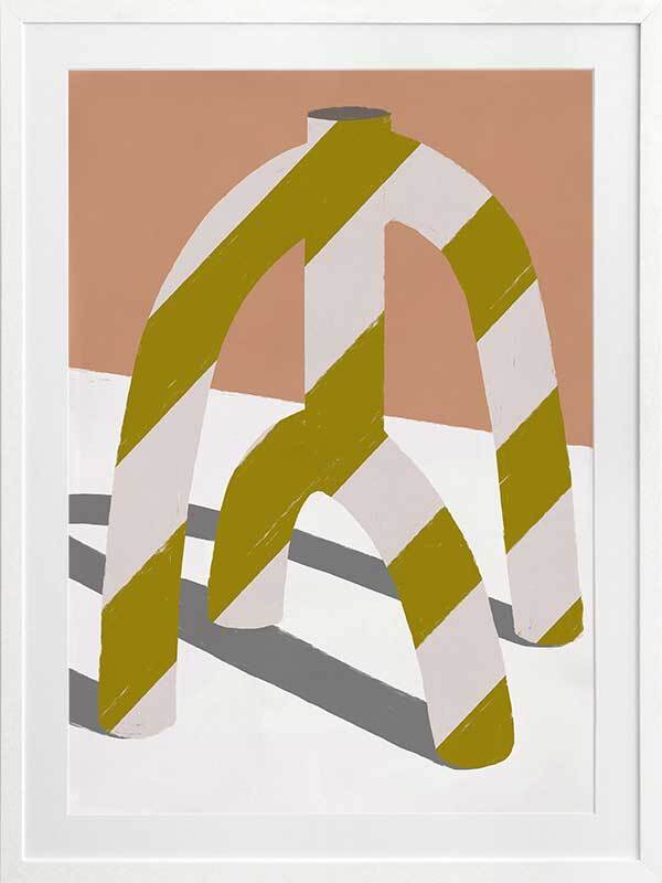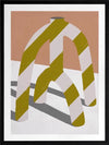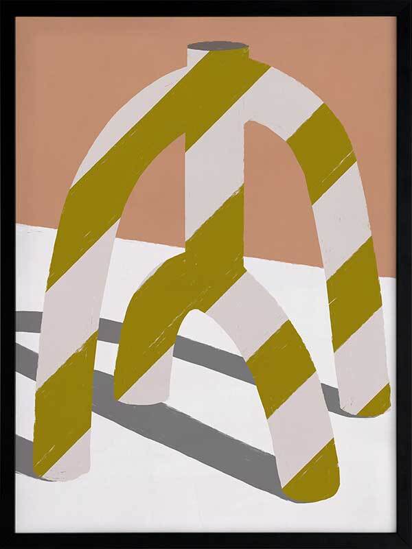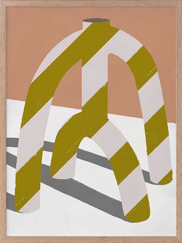 Sahara Framed Art Print - Inspired by our striking Elyn Ceramic Vessel, this piece plays with light and shadow to create a simple, yet graphic design. Featuring the clean, symmetrical structure and soft curves of Elyn, with statement-making golden-toned yellow stripes, all against a peachy pink and white backdrop. Like the myriad of textures you'll find among handmade pieces along the market streets of Marrakech, this artwork features a texturized look to enhance that rustic feel.