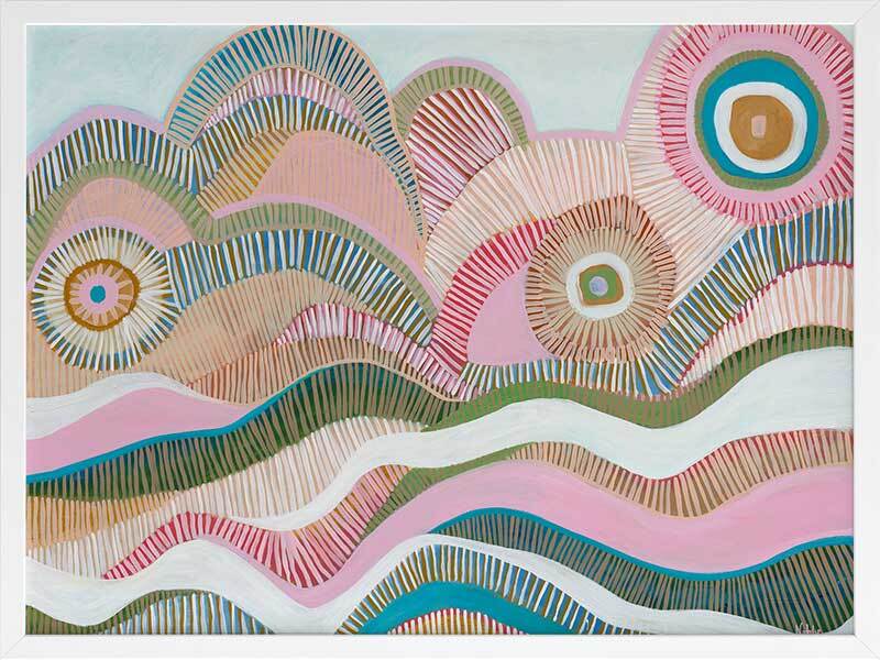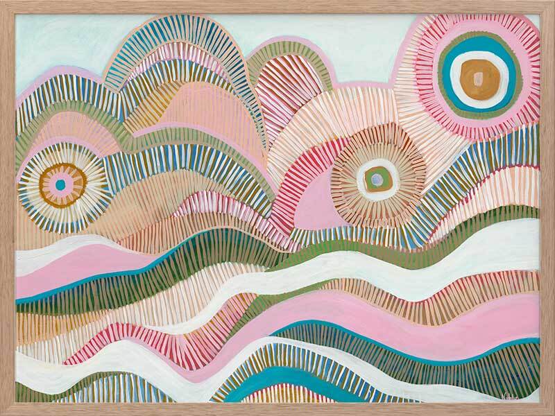 Sail Away Framed Art Print - Playful and meditative, this artwork showcases the impacts of texture, line and shape to create the feeling of calm and serenity. The soft, pastel colour palette features pink, mint green and peach, alongside deeper muted green and teal accents.