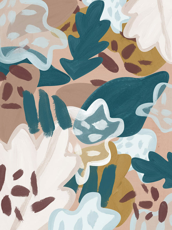 An intricate abstract piece featuring bold shades of teal, maroon, mustard and pink.