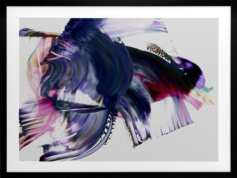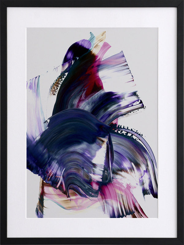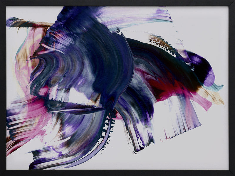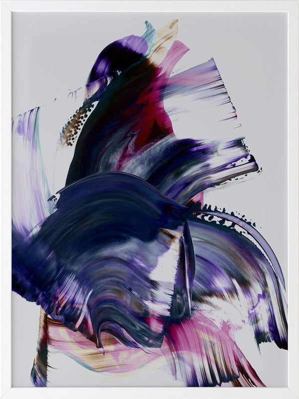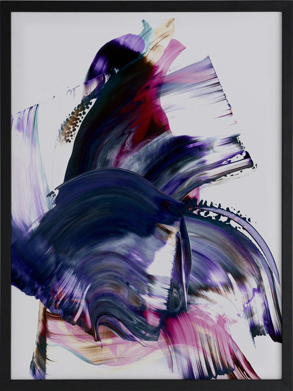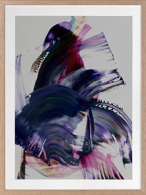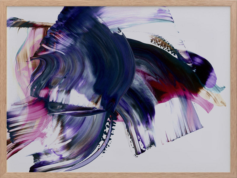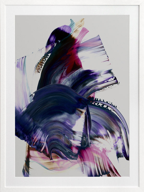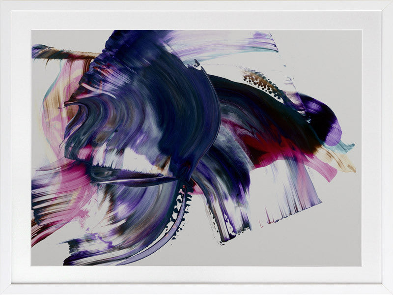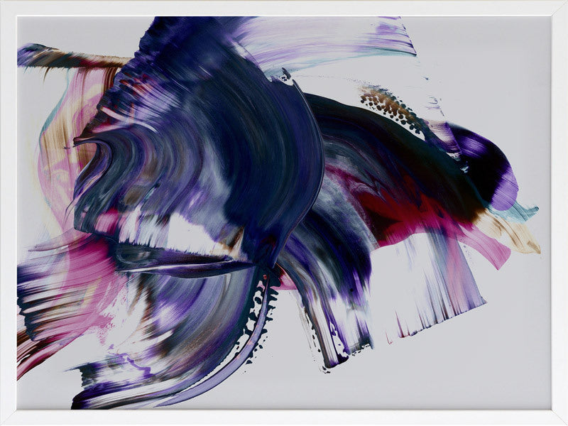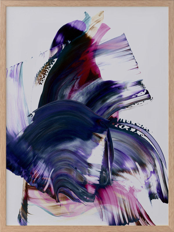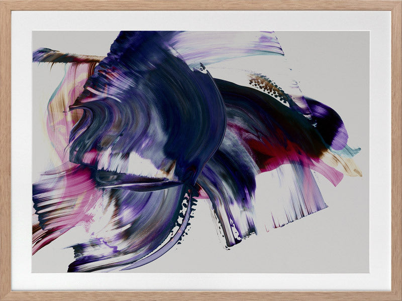 Scarborough Framed Print: A vibrant and colourful artwork featuring broad, purple, magenta and navy squeegee strokes, with flecks of brown and teal, against a light grey background. 2019 AUTUMN/WINTER COLLECTION: ODYSSEY