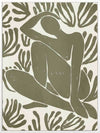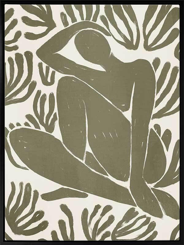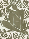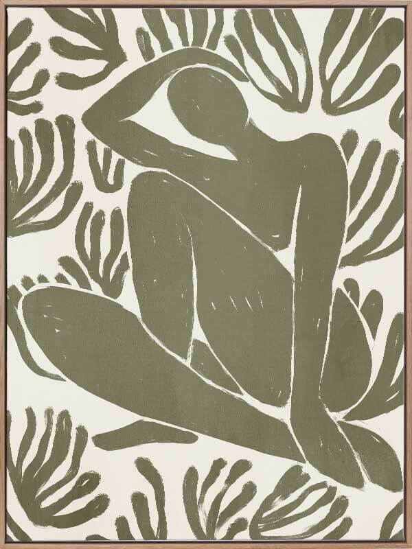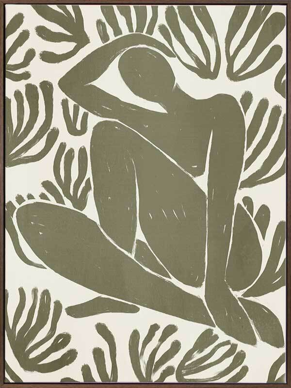 Self-Care I Canvas Art Print - Derived from the abstract work of Matisse, this piece uses a muted green shade complimenting a soft cream background. Featuring a human figure in the centre, sitting among organic leaf-like shapes, an overwhelming sense of serenity comes across with thoughtful, smooth brush strokes and uneven linework. An understated energy that brings character to any wall, suitable for most interior styles.