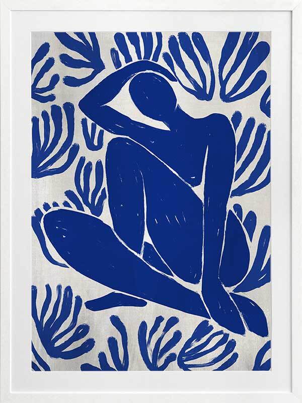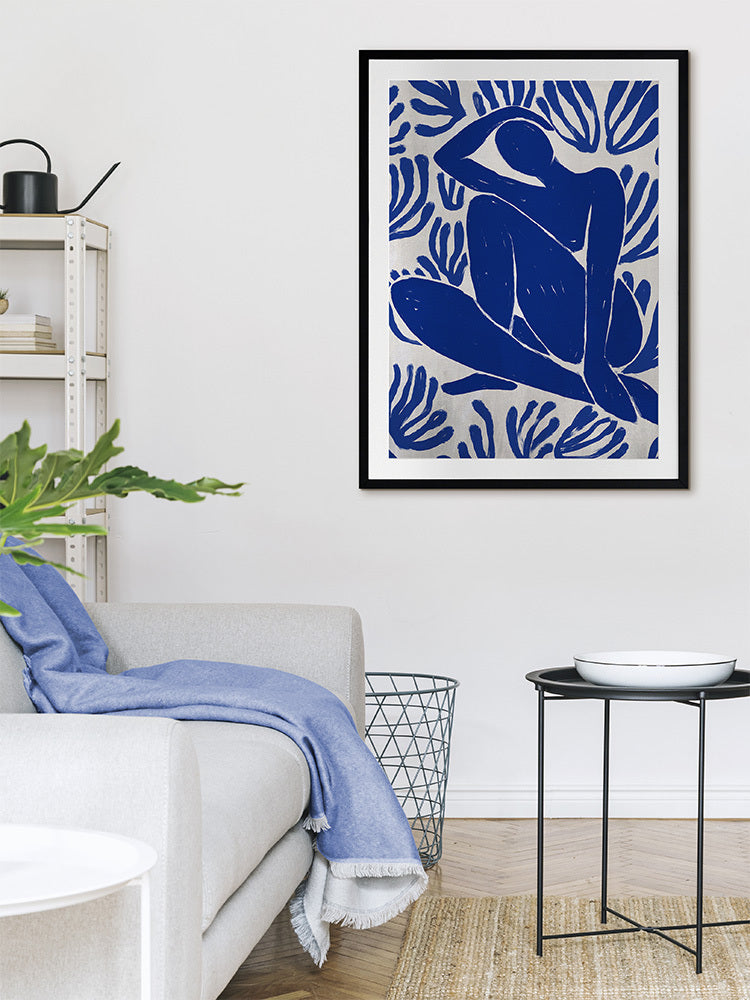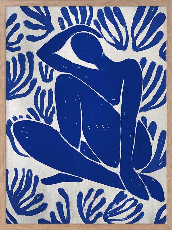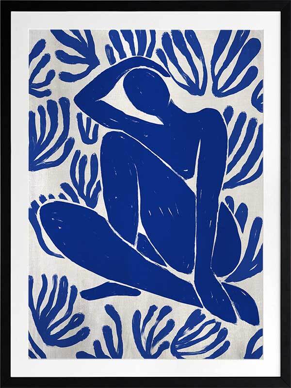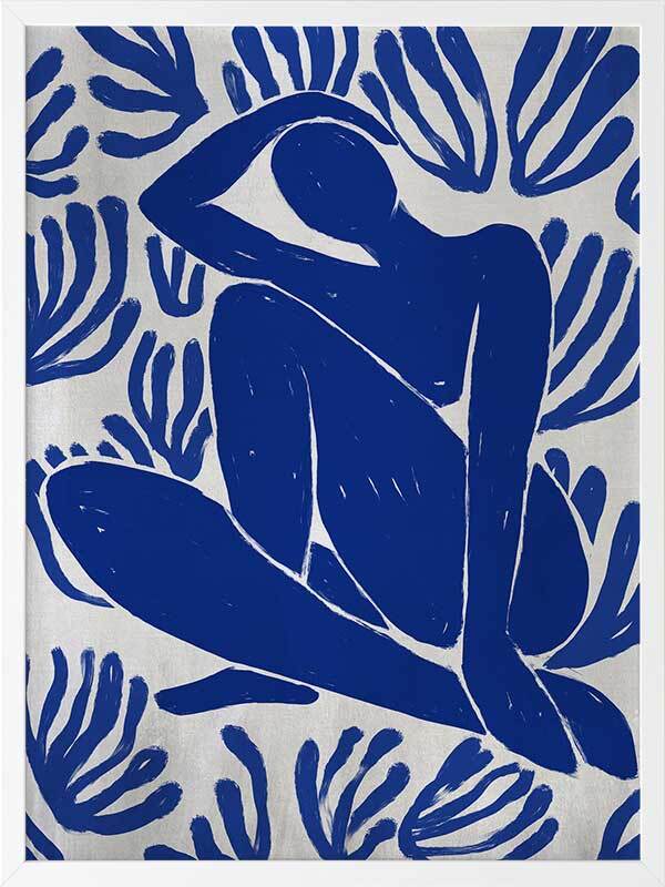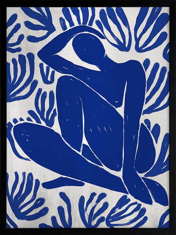 Self-Care II Framed Art Print - Derived from the abstract work of Matisse, this piece uses a midnight blue shade complimenting a soft cream background. Featuring a human figure in the centre, sitting among organic leaf-like shapes, an overwhelming sense of serenity comes across with thoughtful, smooth brush strokes and uneven linework. An understated energy that brings character to any wall, suitable for most interior styles.