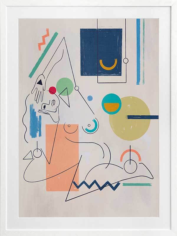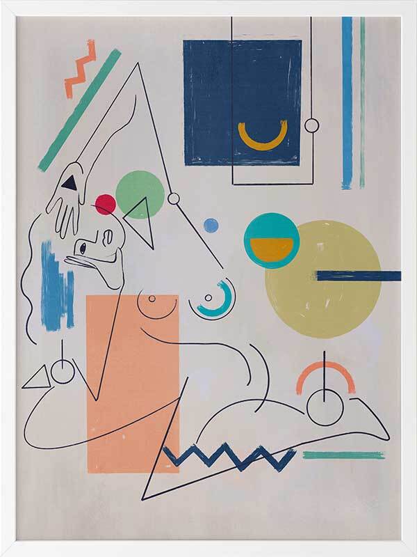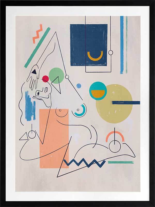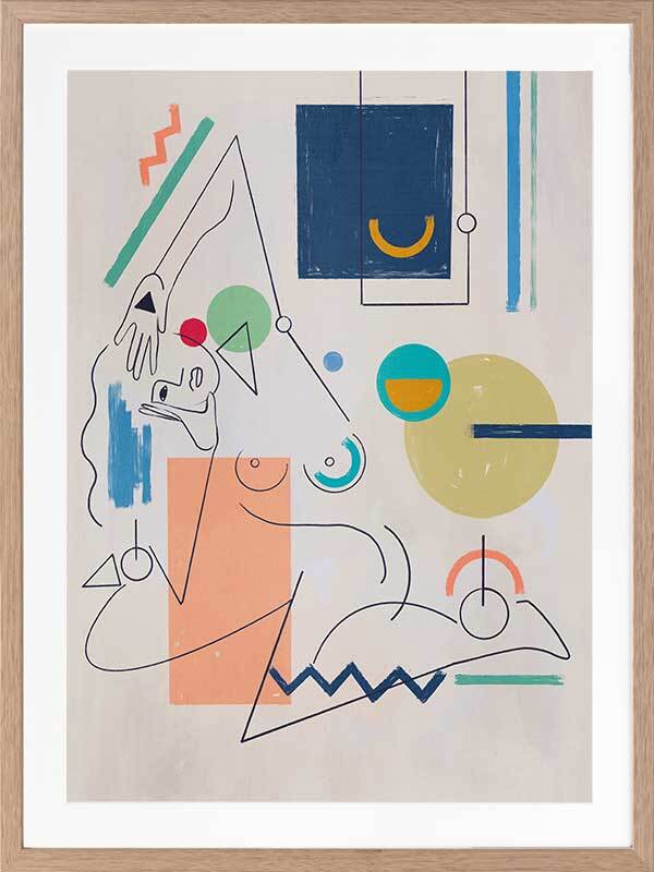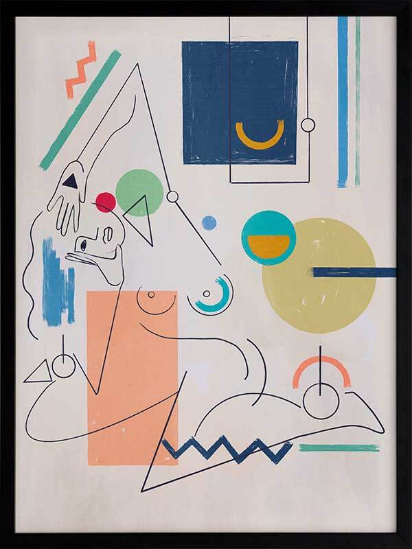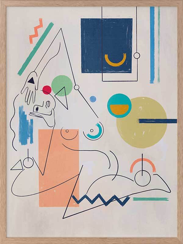 Self Portrait Framed Art Print - Deconstruct the way you look at the world with this unique perspective of a female figure's self-portrait. Using fragmented shapes and lines, with unfinished details for a relaxed look, this abstract piece brings a sense of movement with its expressive design. A colourful palette ranging from peach, yellow, green, red, and dark and light blue makes it perfect for adding a pop of colour to your space.