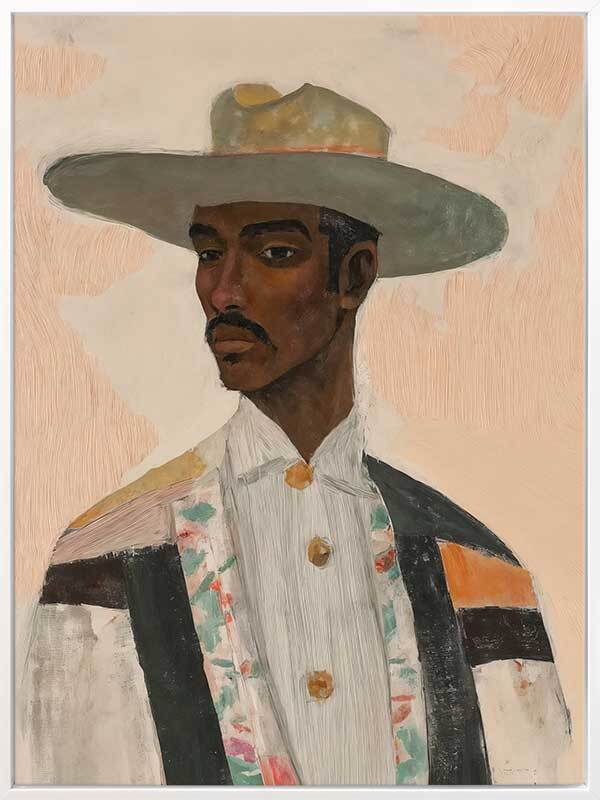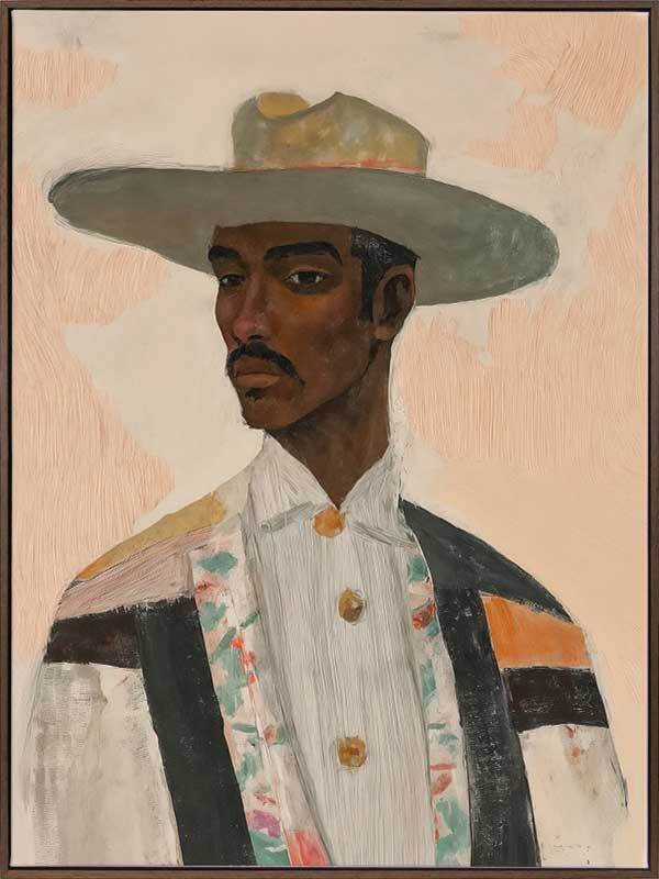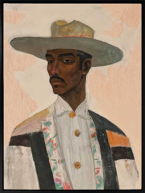 Señor Canvas Art Print - This beautiful portrait artwork brings Mexican culture to life with a man wearing a wide-brim cowboy hat sitting steady and direct. A soft, painterly style creates a calm atmosphere, with a subtle palette of light pink, beige, off-white, and hints of orange, blue, and black.