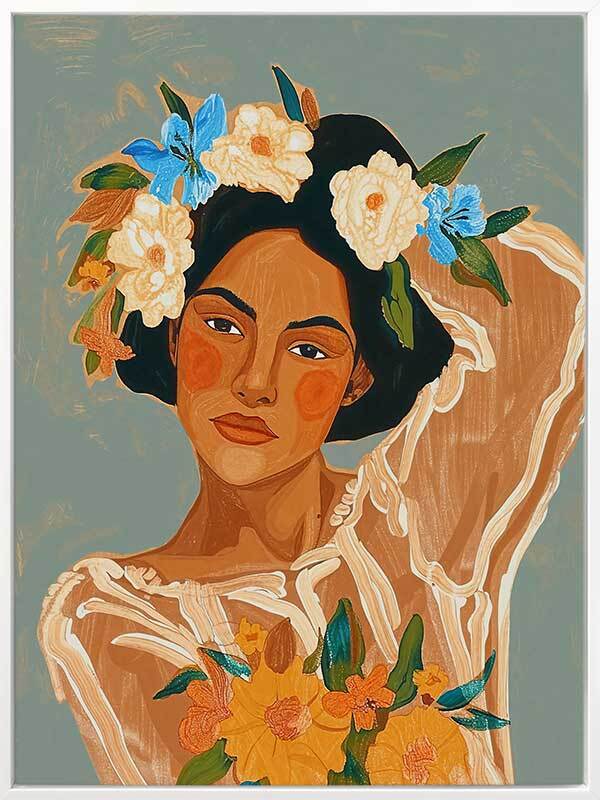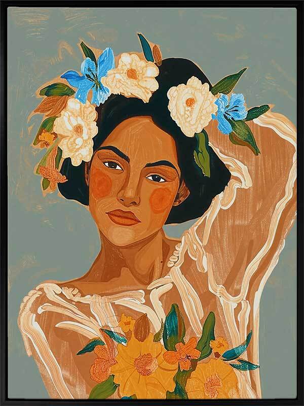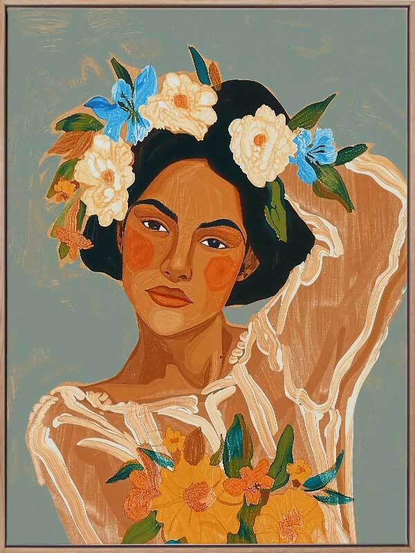 Senorita Canvas Art Print - Senorita meaning 'woman', this portrait artwork is a breathtaking depiction of a Mexican woman, wearing a crown of florals in her black hair and a regal, whimsical way about her. Using soft, flowing brush strokes, her form is cradled by a seafoam green backdrop, letting warm brown, orange, blue, and yellow shades pop.