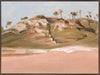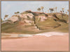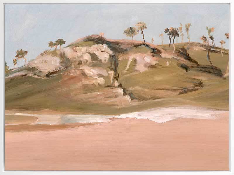 Serene Grassy Hills Canvas Art Print - Escape to the serene rolling hills of this secret shoreline, where the sun warms the sand and the grass glows. This landscape artwork embodies a coastal feel with neutral shades of green, beige and white, with a pale blue sky, perfect for bringing calm to any space.