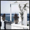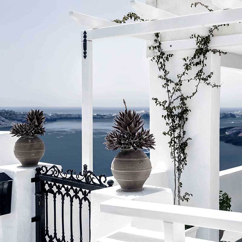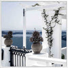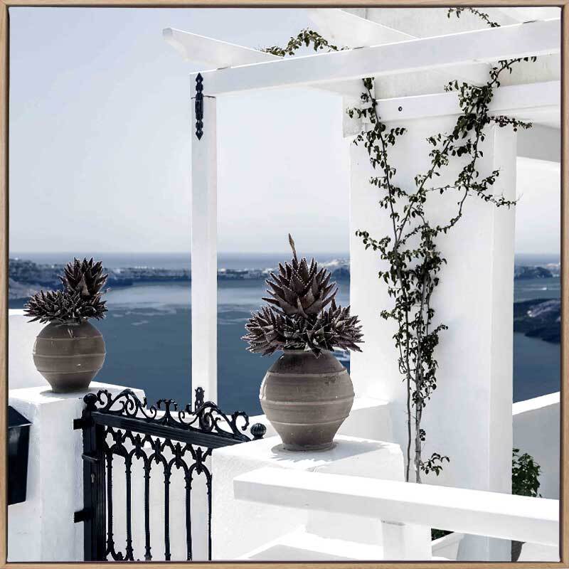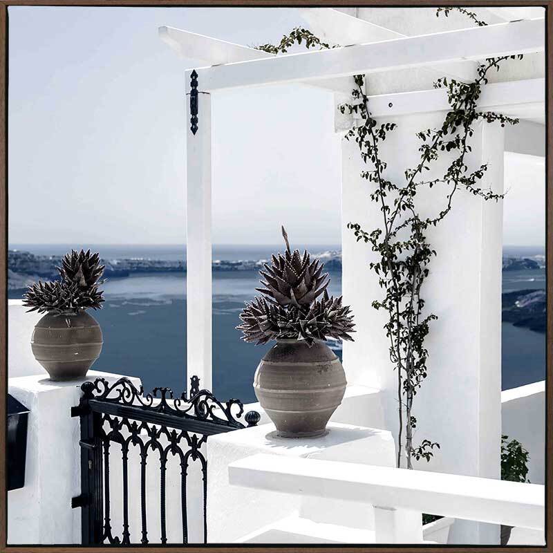 Seventh Heaven Canvas Art Print - This photographic art print depicts a dreamy coastal resort on a Greek island, with its distinctive clean, bright white shades and endless blue sea on the horizon. Simple white, blue, dark green, and black shades make this a versatile travel photography piece.