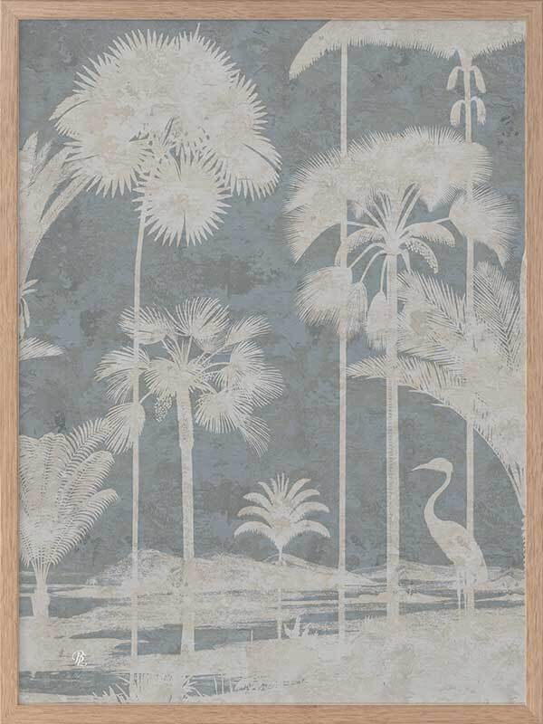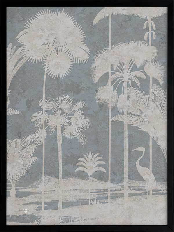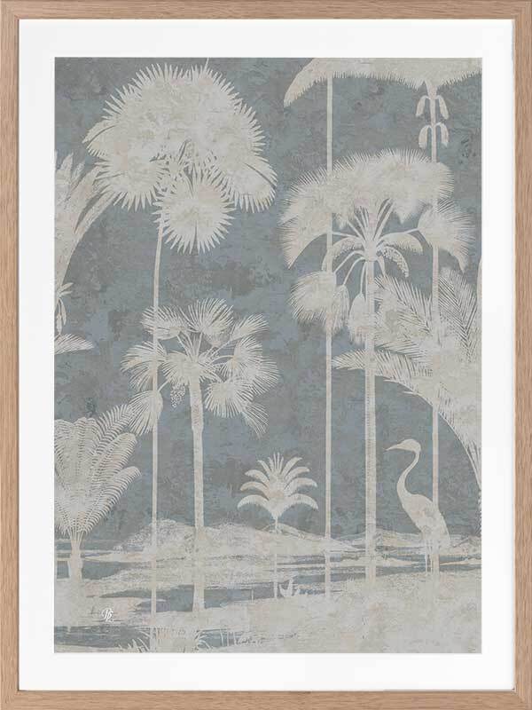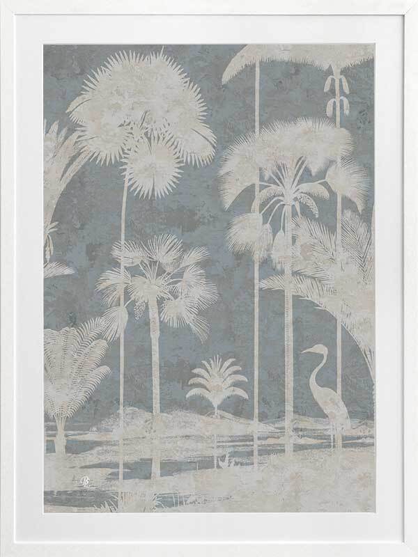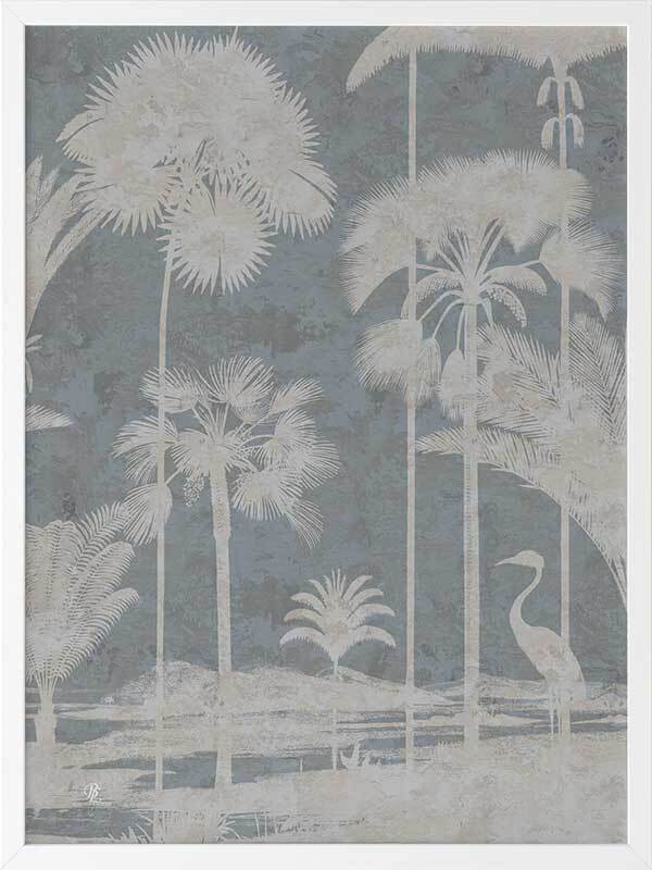 Shadow Palms Blue II Framed Art Print - Just as the sun rises with its soft, gentle light, wildlife begin to stir, basking in the warm, early rays. This gorgeous piece focuses on simplicity with a subdued, monotone colour palette and limited details, leaving an array of shadow figures, allowing the aged texture to overlap each silhouette for a timeless feel. With its pale blue and cream white palette, Shadow Palms is striking, yet delicate on the eye, making it the perfect feature piece for any interior.