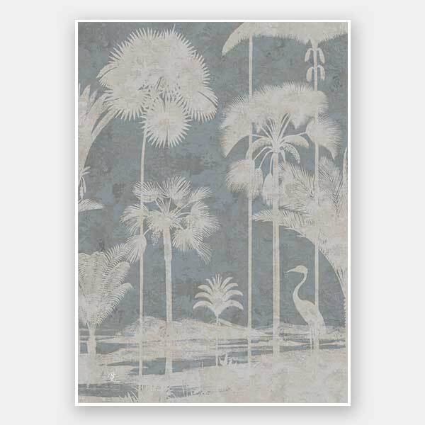 Shadow Palms Blue II Unframed Art Print - Just as the sun rises with its soft, gentle light, wildlife begin to stir, basking in the warm, early rays. This gorgeous piece focuses on simplicity with a subdued, monotone colour palette and limited details, leaving an array of shadow figures, allowing the aged texture to overlap each silhouette for a timeless feel. With its pale blue and cream white palette, Shadow Palms is striking, yet delicate on the eye, making it the perfect feature piece for any interior.