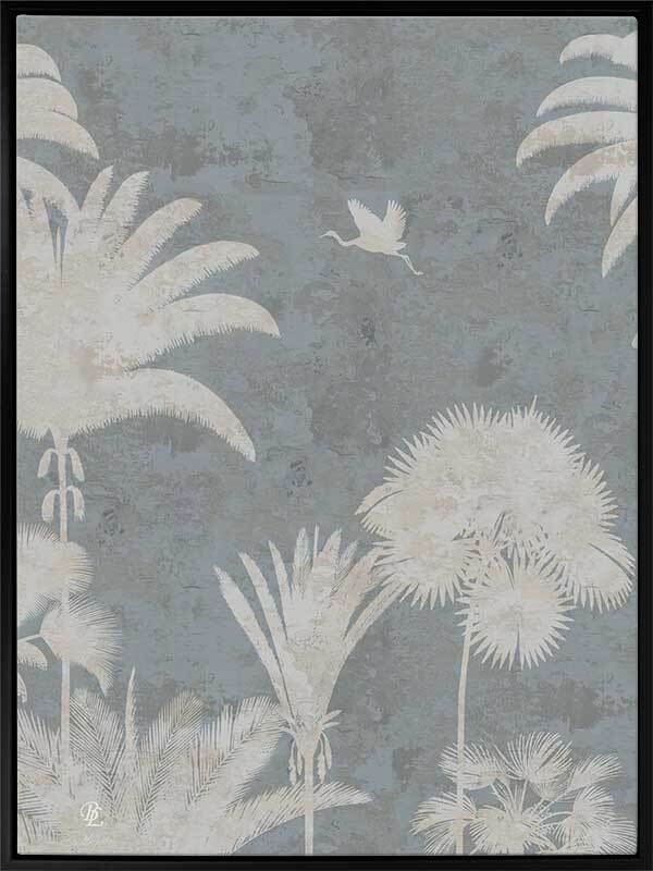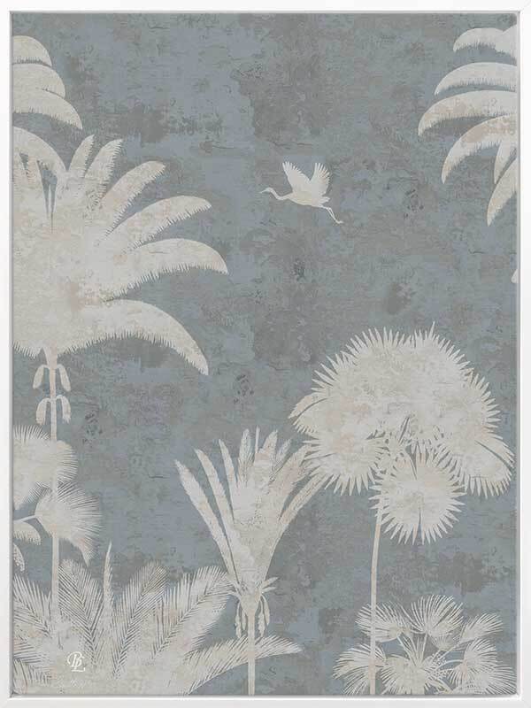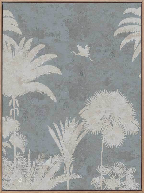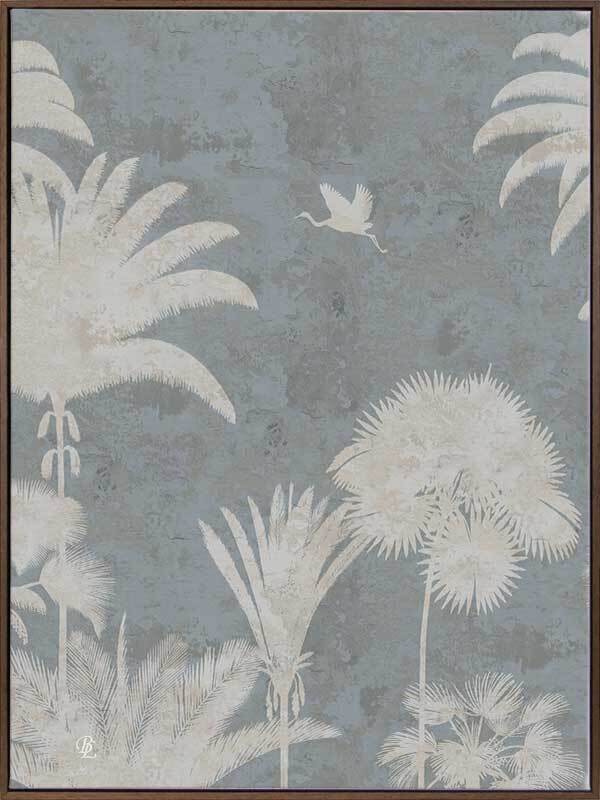 Shadow Palms Blue III Canvas Art Print - Just as the sun rises with its soft, gentle light, wildlife begin to stir, basking in the warm, early rays. This gorgeous piece focuses on simplicity with a subdued, monotone colour palette and limited details, leaving an array of shadow figures, allowing the aged texture to overlap each silhouette for a timeless feel. With its pale blue and cream white palette, Shadow Palms is striking, yet delicate on the eye, making it the perfect feature piece for any interior.