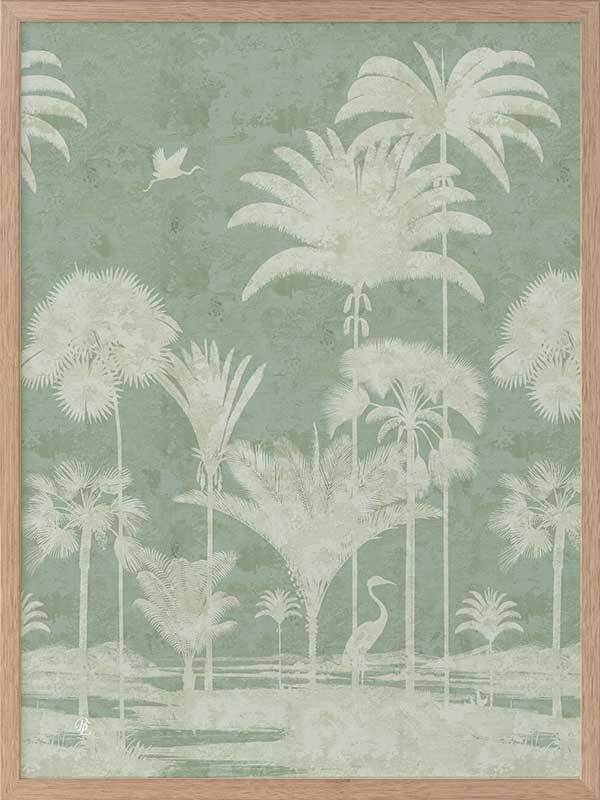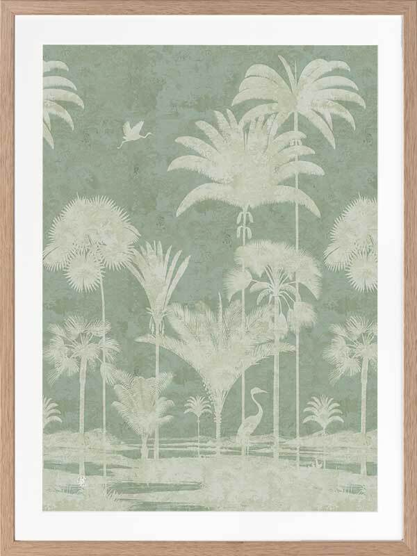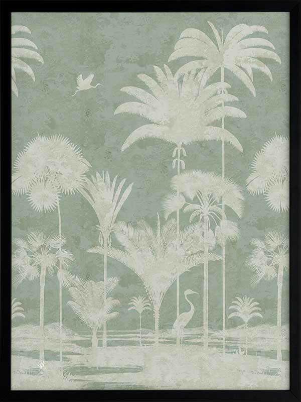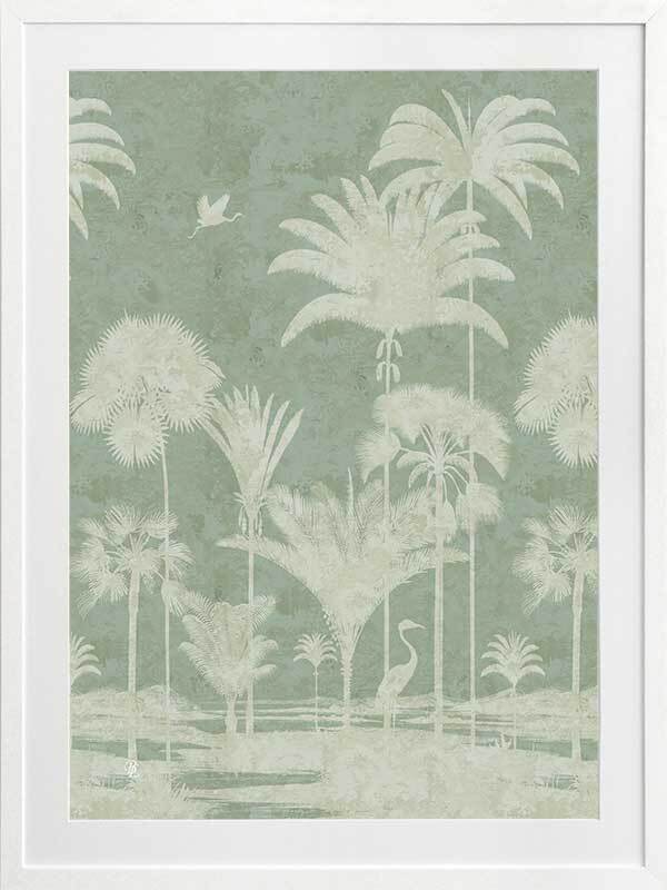 Shadow Palms Mint I Framed Art Print - Just as the sun rises with its soft, gentle light, wildlife begin to stir, basking in the warm, early rays. This gorgeous piece focuses on simplicity with a subdued, monotone colour palette and limited details, leaving an array of shadow figures, allowing the aged texture to overlap each silhouette for a timeless feel. With its soft mint green and white palette, Shadow Palms is striking, yet delicate on the eye, making it the perfect feature piece for any interior.