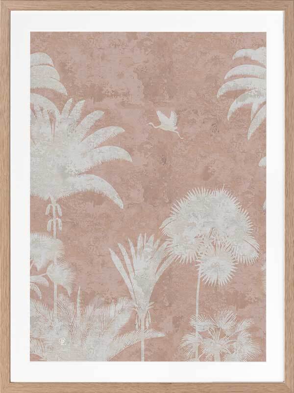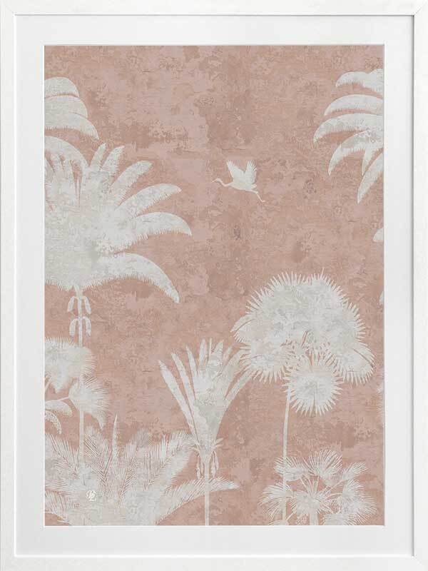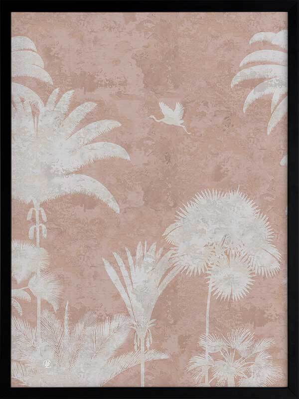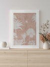 Shadow Palms Pink III Framed Art Print - Just as the sun rises with its soft, gentle light, wildlife begin to stir, basking in the warm, early rays. This gorgeous piece focuses on simplicity with a subdued, monotone colour palette and limited details, leaving an array of shadow figures, allowing the aged texture to overlap each silhouette for a timeless feel. With its rose pink and white palette, Shadow Palms is striking, yet delicate on the eye, making it the perfect feature piece for any interior.