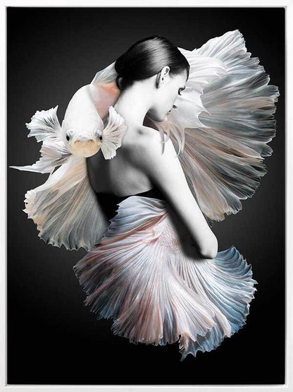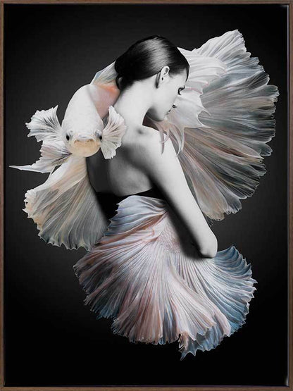 Shai Canvas Art Print: An elegant black and white portrait blended with delicate fantasy-inspired features of the feather tail betta fish. 2017 AUTUMN/WINTER COLLECTION: ILLUSION