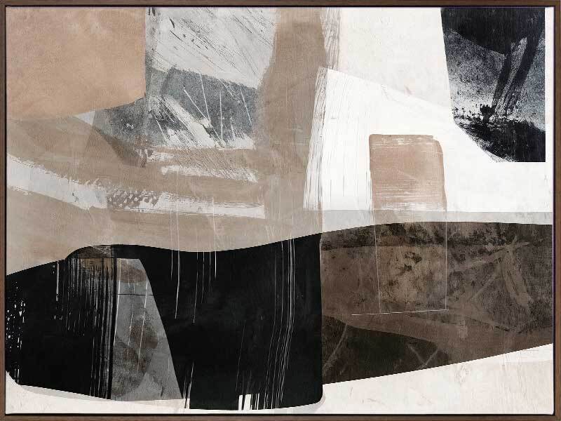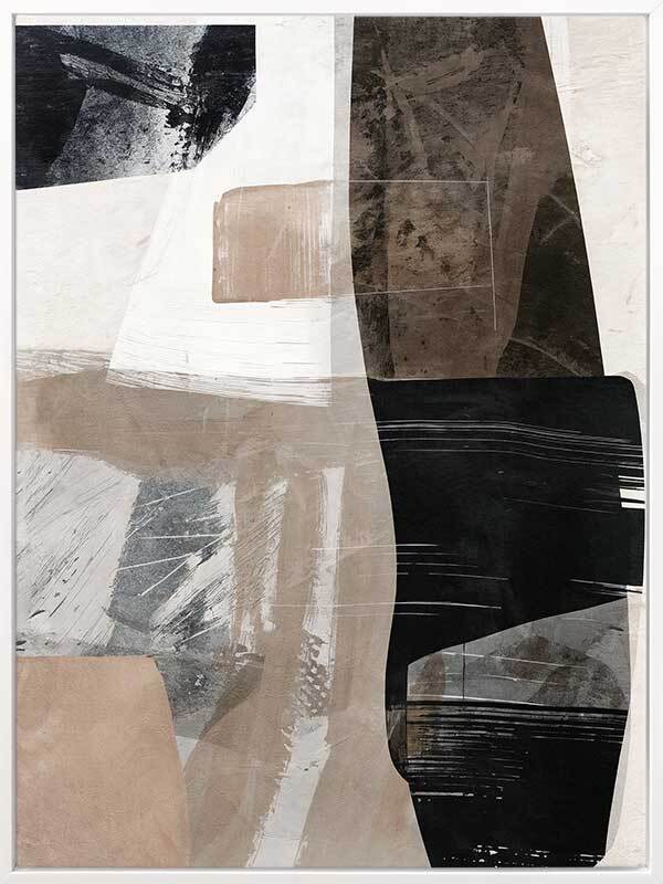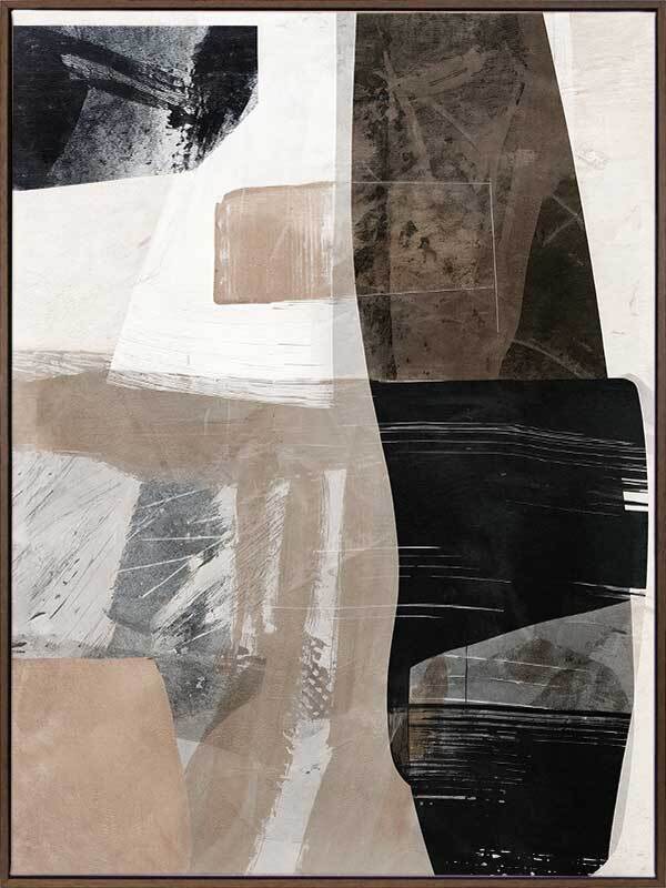 Shapeplay II Canvas Art Print - Add depth and character to your space with this moody abstract artwork, ideal as a bedroom art print to bring the space to life. Among minimal brush strokes and overlapping shapes, the palette remains simple with black, sand, grey, and white shades.