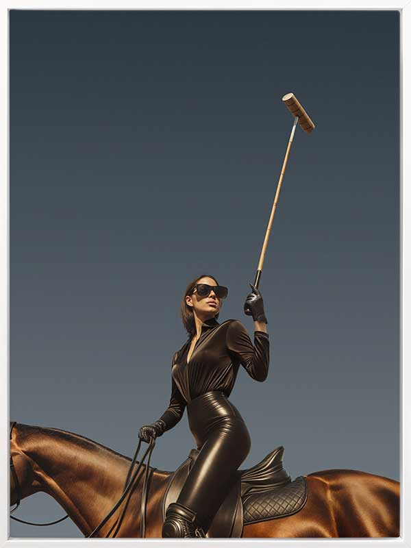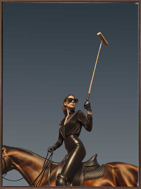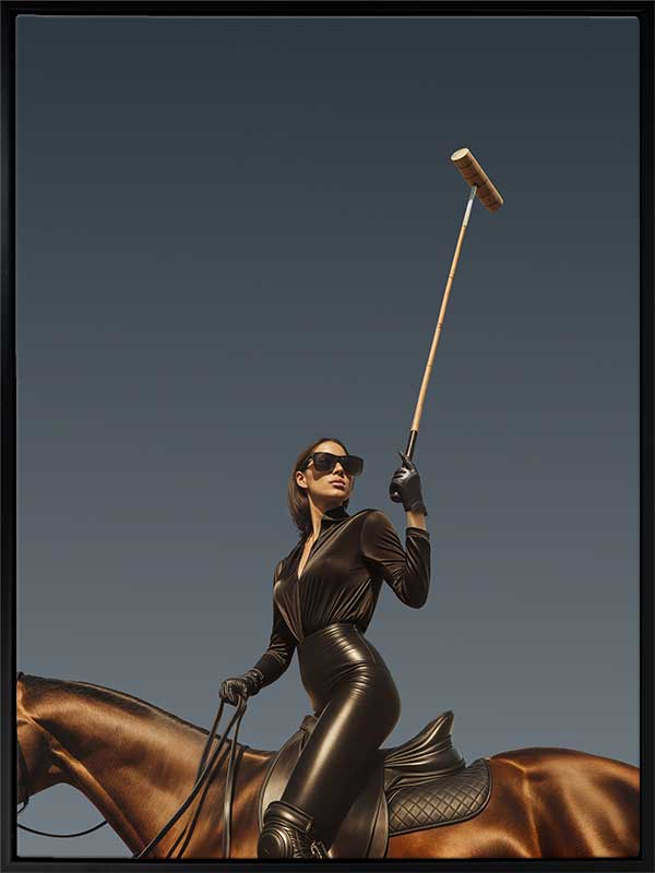 She’s a Polo Player Canvas Art Print - Chic, powerful, and striking, this portrait art print celebrates confident femininity. Dominated by rich tones of deep browns, blacks, and sophisticated neutrals, this photographic horse wall art captures modern glamour with an empowering spirit. Ideal for interiors seeking stylish drama, elegance, and equestrian flair, it makes a bold statement in any contemporary setting.