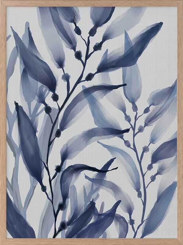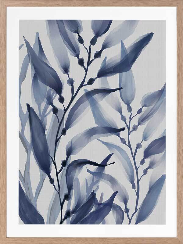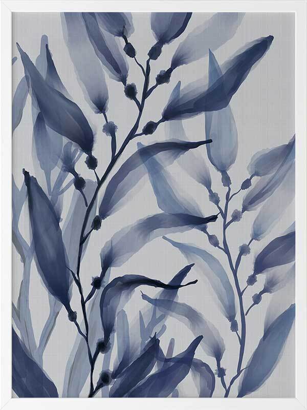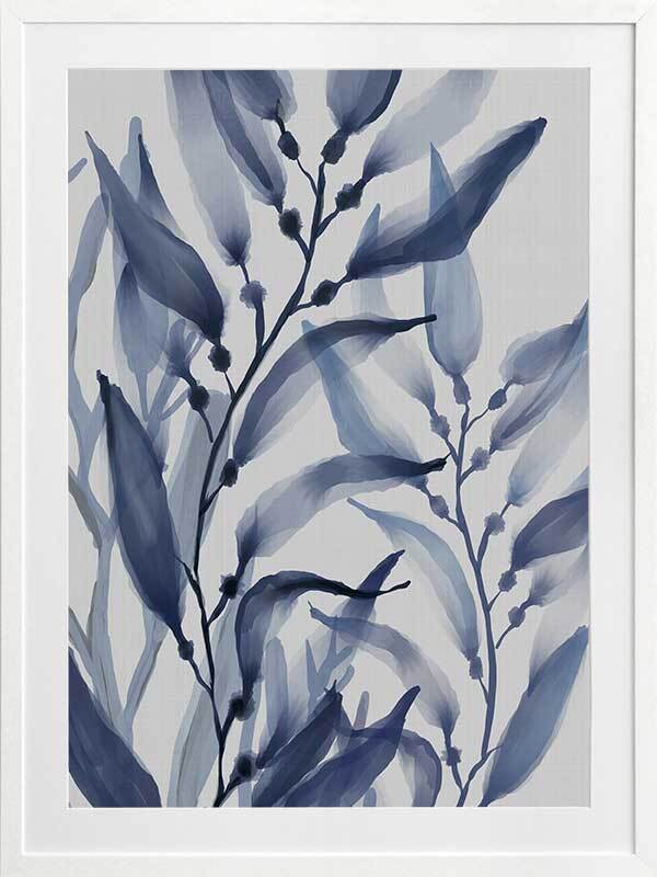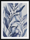 Shelter Island I Framed Art Print - This Hamptons style artwork features soft, delicate indigo blue watercolour sea grass moving across a soft grey background. Pairs with Shelter Island II.