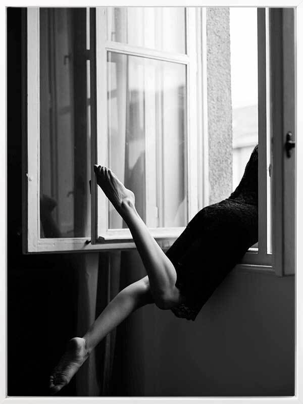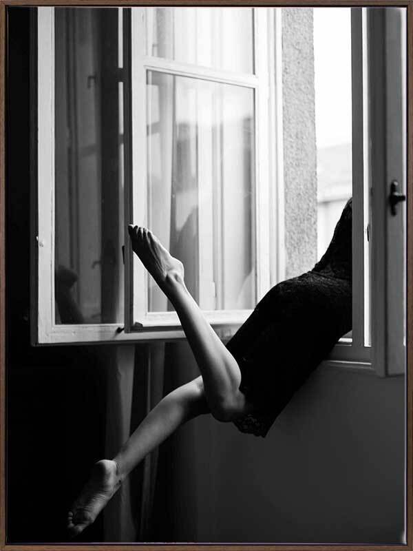 She's In Love Canvas Art Print - Is she in love with someone, or the city itself? This photographic art print brings a chic, playful, and vintage vibe to any space with a black-and-white theme, featuring a woman joyfully peering out the window, the sun shining, ready to take on the day.
