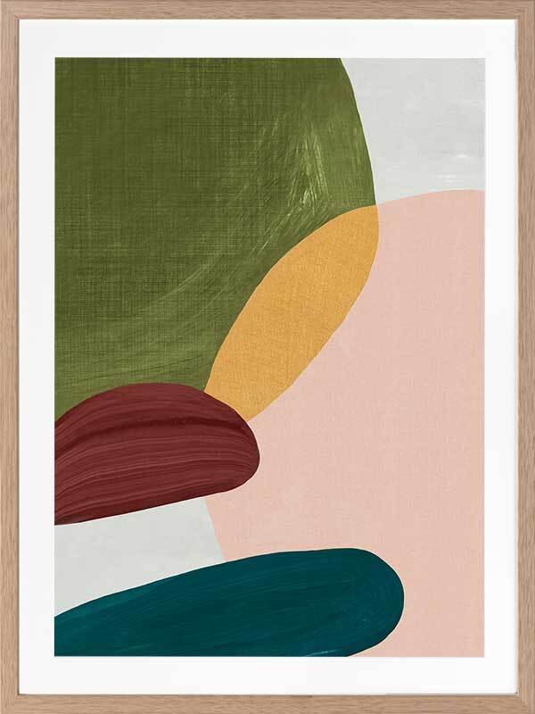 Shifting Shapes I Framed Art Print - A deconstruction of rounded shapes falling one on top of the other, blending to form an elegant, statement-making design. A pale grey tone makes up the background, while khaki green, yellow, dark red, blue, and pink stand out in the foreground.