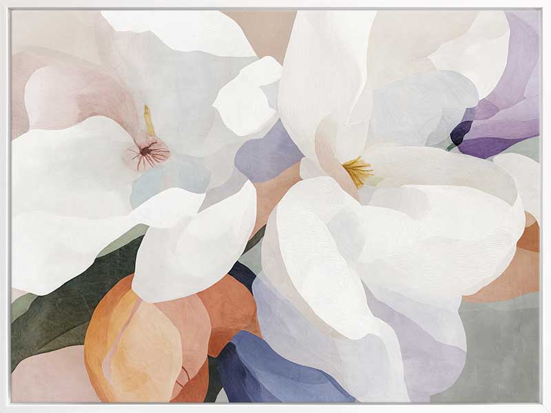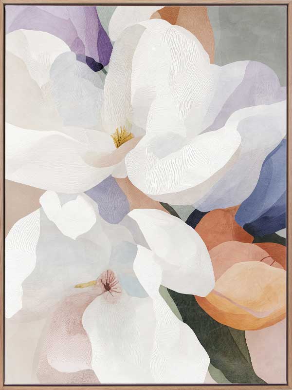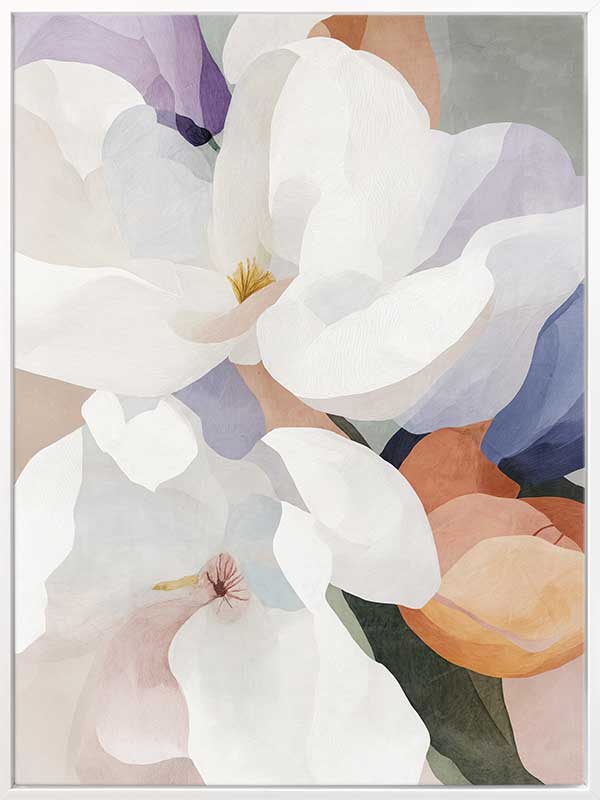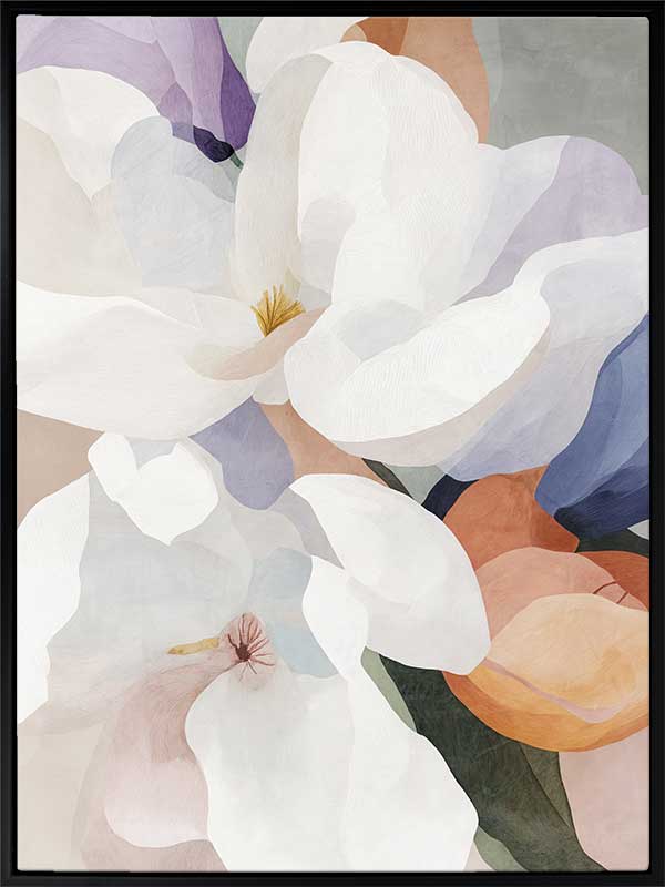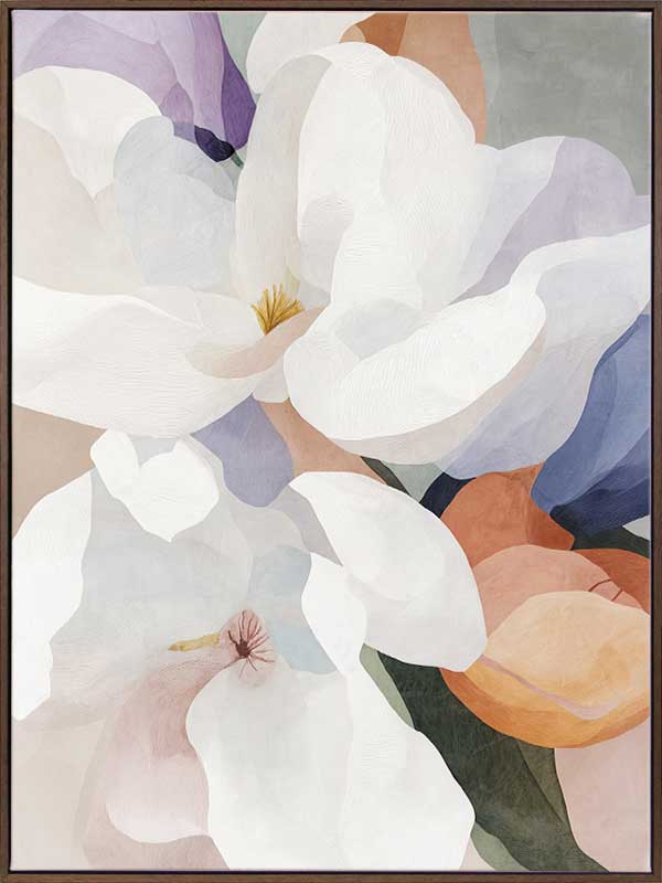 Silk Petals I Canvas Art Print - A delicate interplay of softness and depth, this floral wall art captures the quiet beauty of flowers. Layers of white, blush, and soft lavender petals unfold against rich earthy hues, creating a sense of effortless grace. This botanical art print makes a perfect addition to any interior, seamlessly complementing modern, classic, or bohemian spaces.
