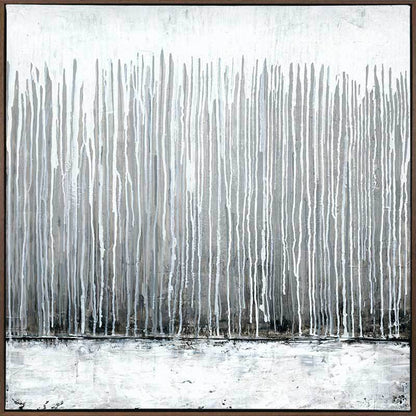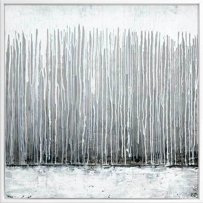 Silver Fog Canvas Art Print: A grungy, industrial style artwork featuring textured paint drips in a cool palette of different shades of grey. 2019 SPRING/SUMMER COLLECTION: SOLSTICE