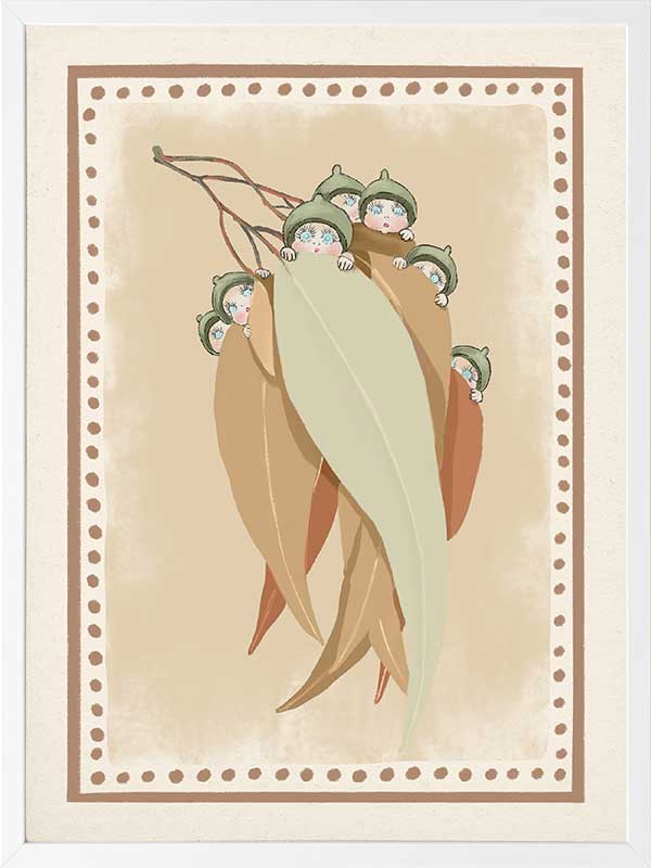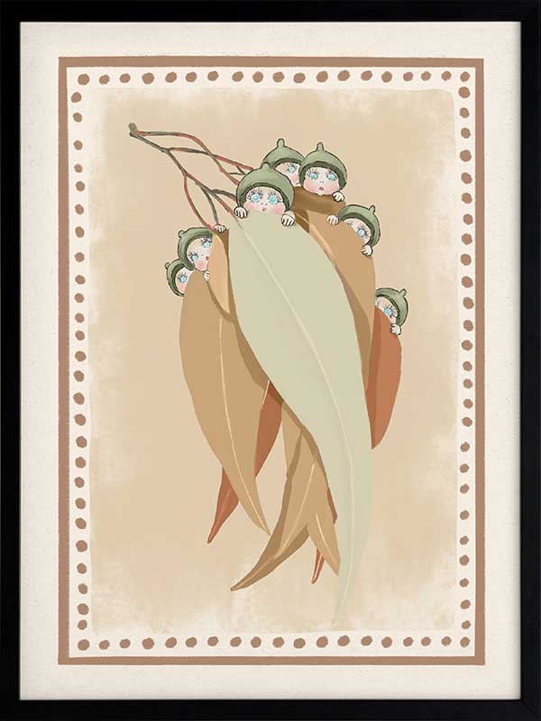 Snugglepot, Cuddlepie & Friends Neutral Framed Art Print - From the Urban Road X May Gibbs Artwork Collection, this charming wall art captures the iconic Snugglepot and Cuddlepie - the first of the bush babies - playing with their friends among the eucalyptus leaves.