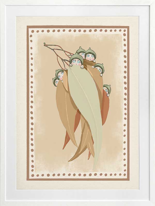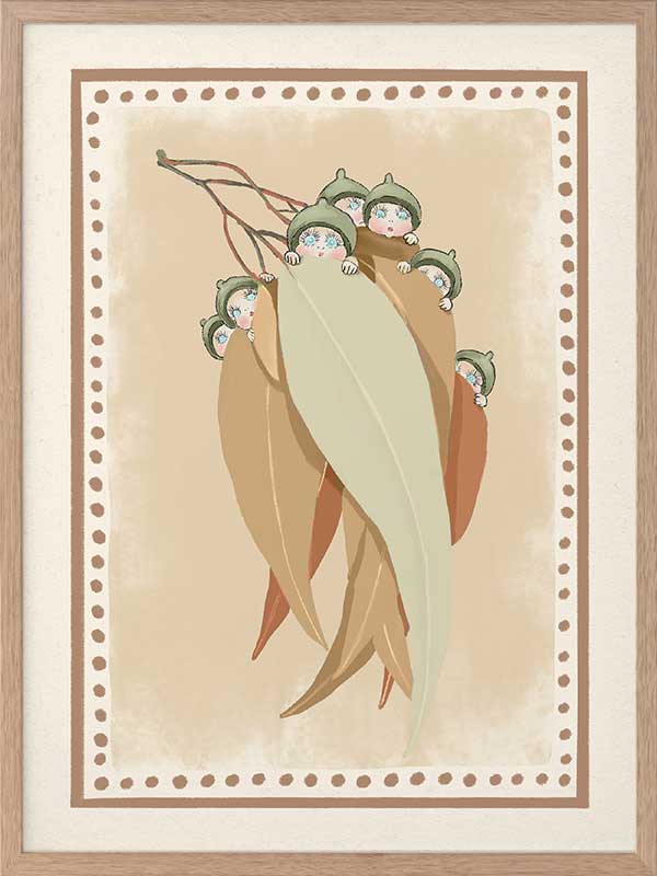 With soft neutral and earthy brown tones set against a gentle cream backdrop, this art print captures the delightful innocence of May Gibbs’ beloved creations. It’s perfect for adding a whimsical, nostalgic touch that celebrates the joy of imagination.