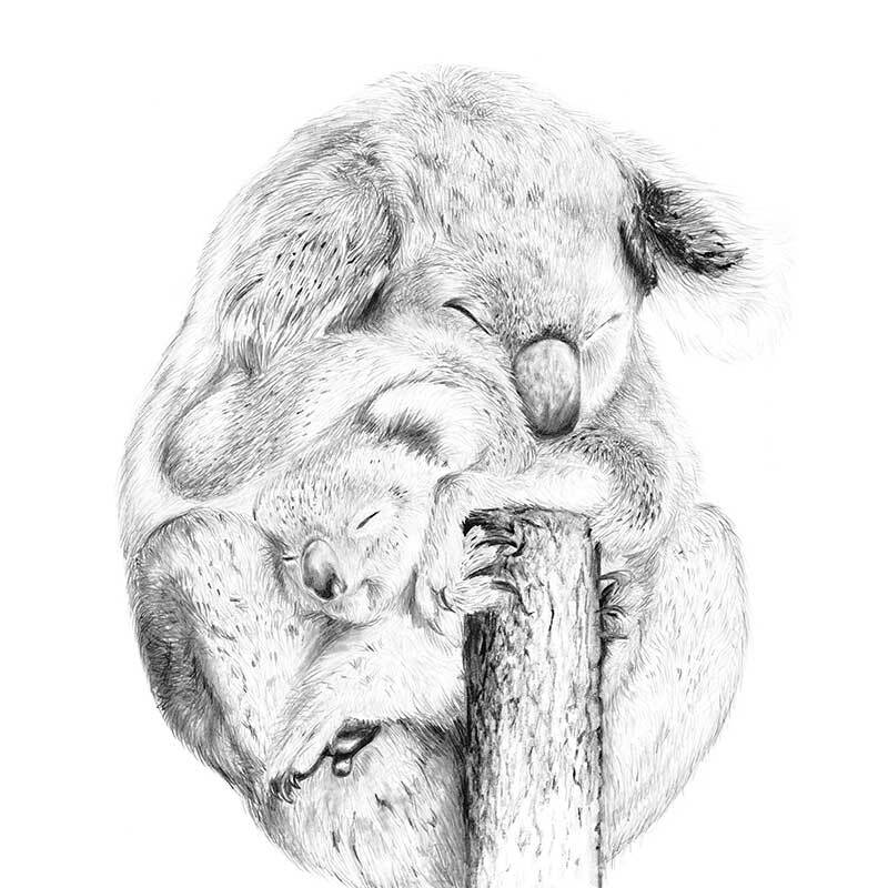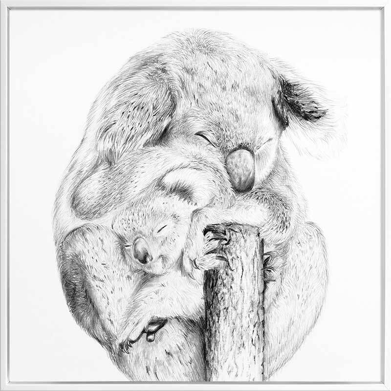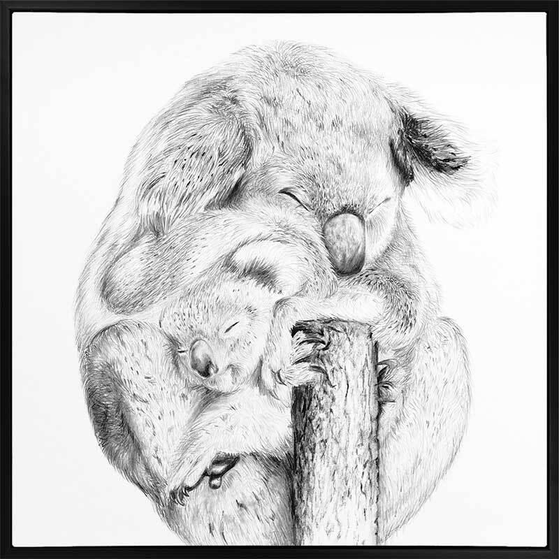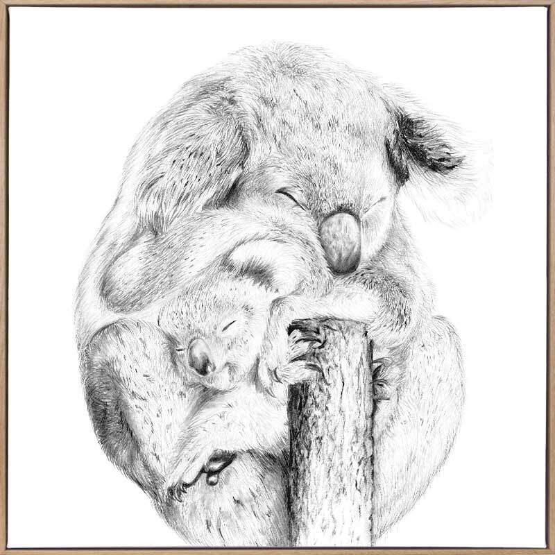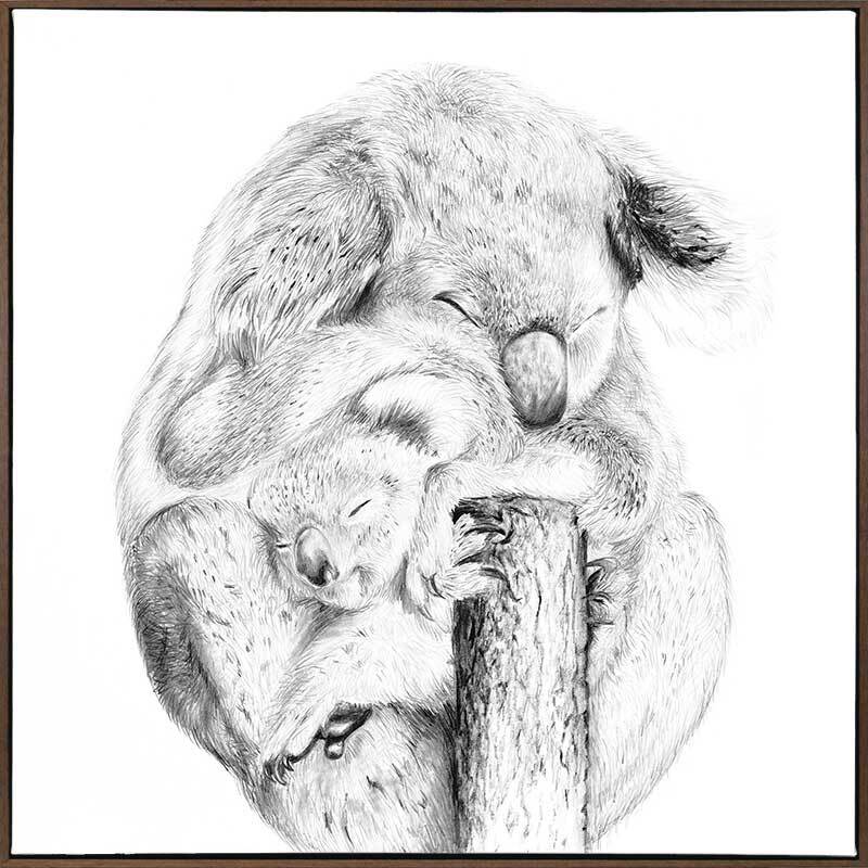 Snuggly Koalas Canvas Art Print - Take a glimpse into the more intimate side of a koala's life, with a detailed sketch of a mother koala and her joey enjoying a gentle moment, nestled in each other's warm embrace. The black, white and grey palette brings a softened energy to this piece, making it a beautiful addition to any space.