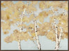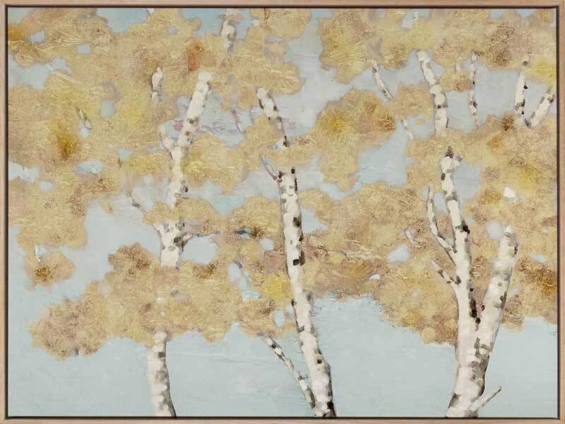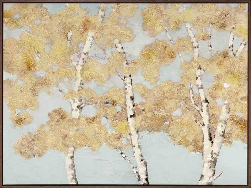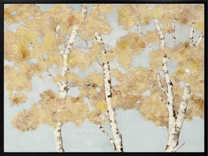 Soft Breeze Canvas Art Print - Take a stroll through the soft breeze of trees up ahead, swaying back and forth in a gentle dance. This piece uses a muted baby blue background to soften the look of tall trees in the foreground, with golden yellow leaves for a slight pop of colour.