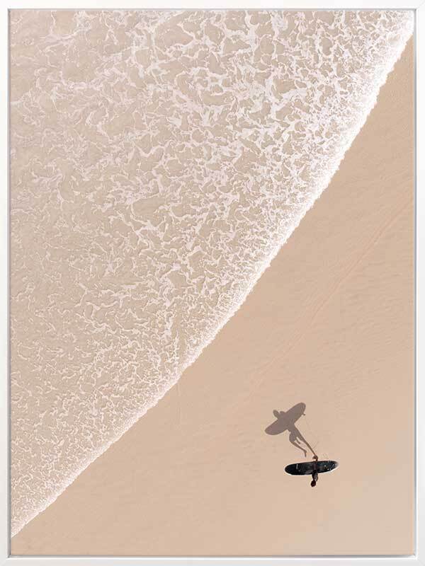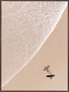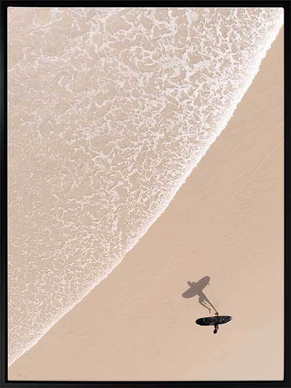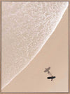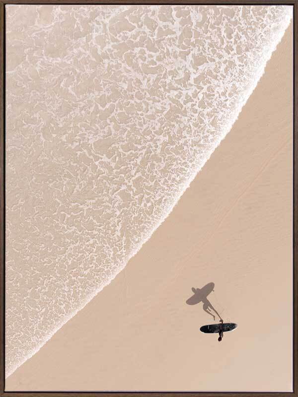 Solitary Surfer Canvas Art Print - This calming and simplistic photographic artwork features an aerial view of a lone surfer walking along a wide sandy shoreline. The beach is a soft, warm beige and the water that cuts across it is dappled white.