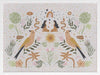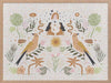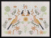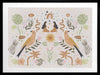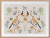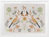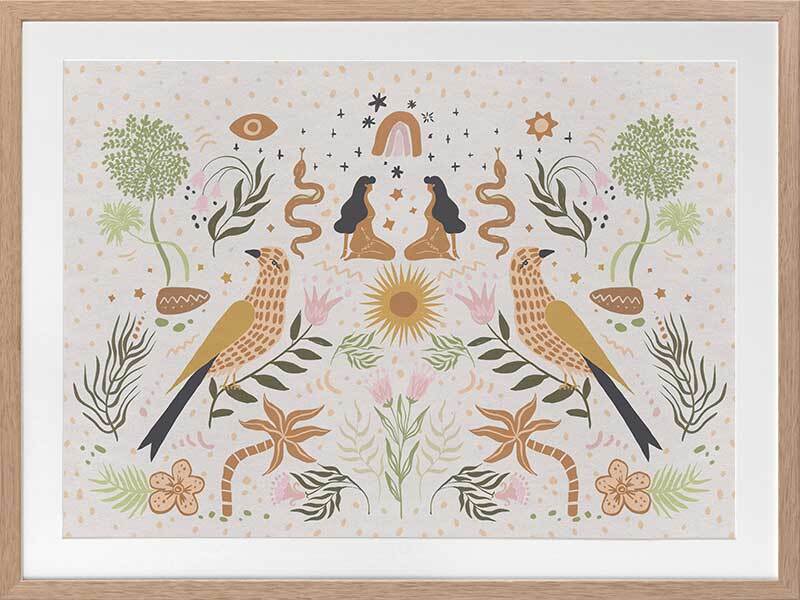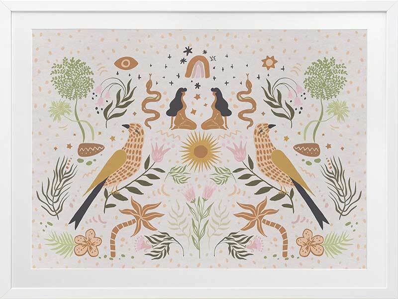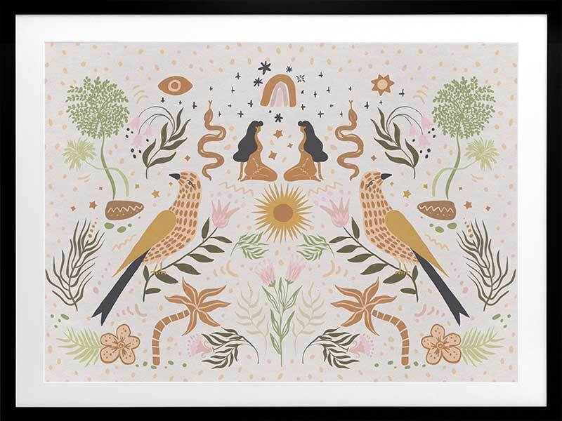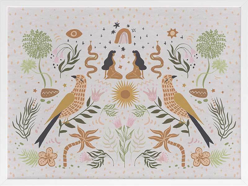Songbird Salutations Framed Art Print - Feminine, playful and ethereal, this bohemian inspired artwork features an eclectic array of illustrations, including female figures, birds, and botanical elements. The colour palette is soft and restrained - warm mustard yellow, soft pink, and fresh green against a textured, light grey background.