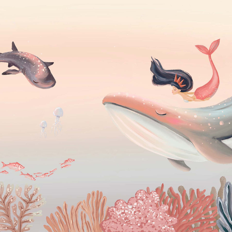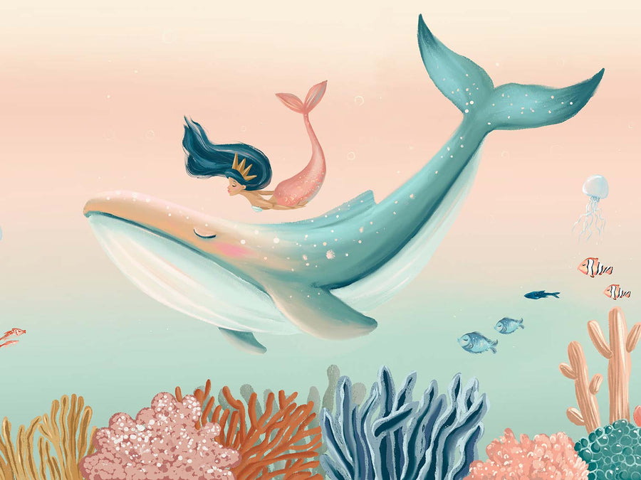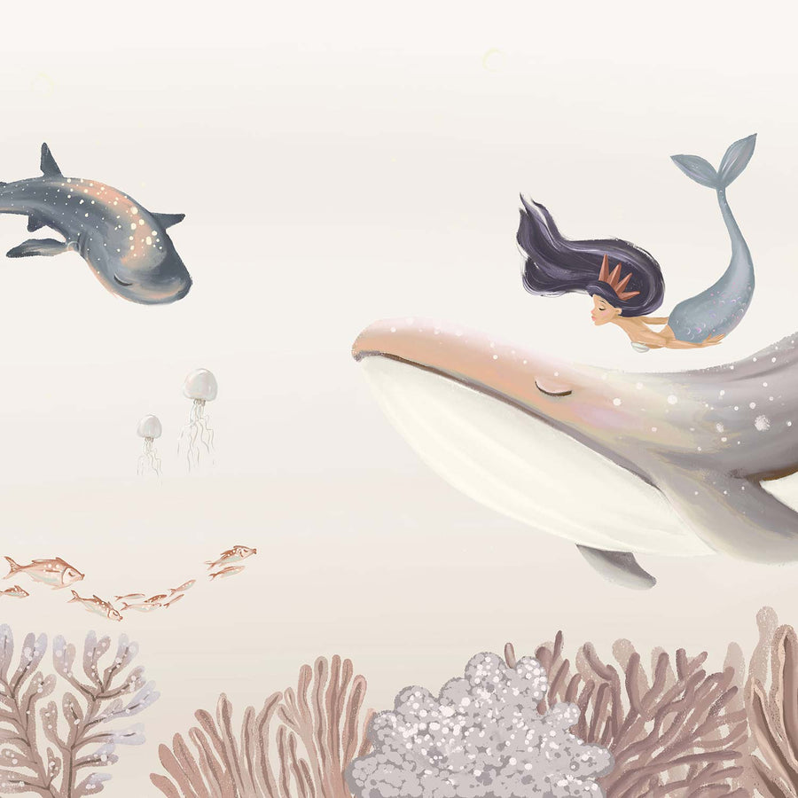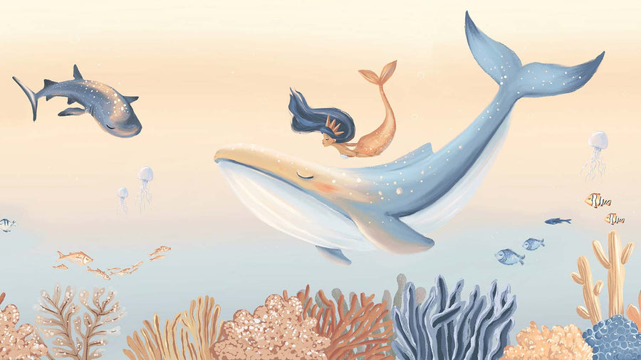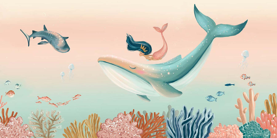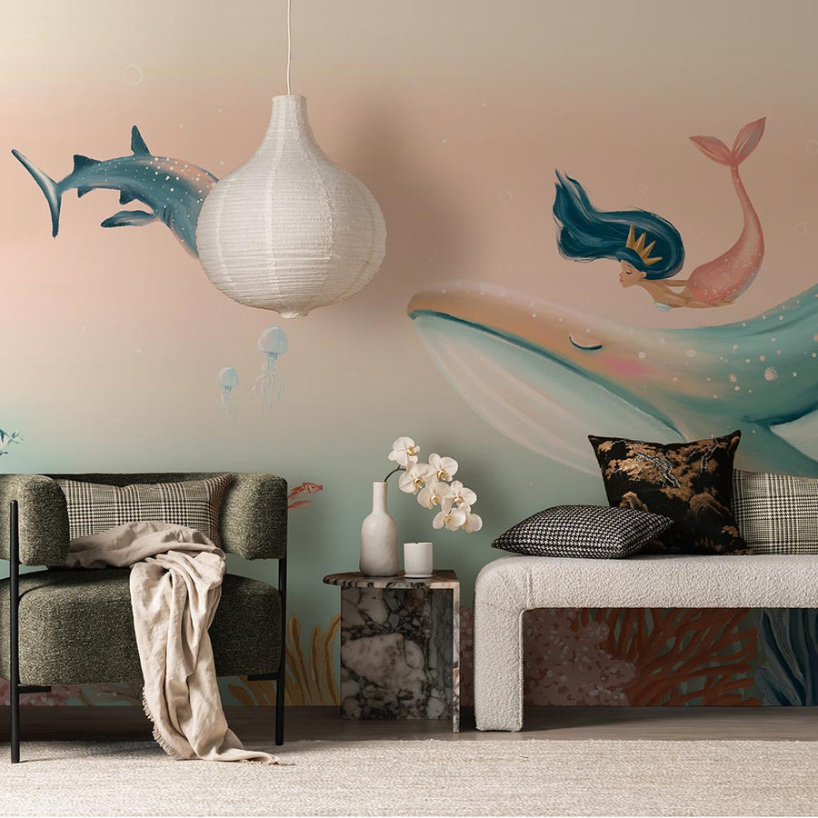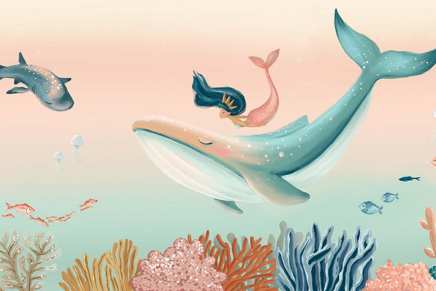 Songs of the Sea Wallpaper Mural - Drift into a dreamy underwater world where friendly whales and mermaids glide through a coral-filled ocean, accompanied by playful fish and gentle sea creatures.