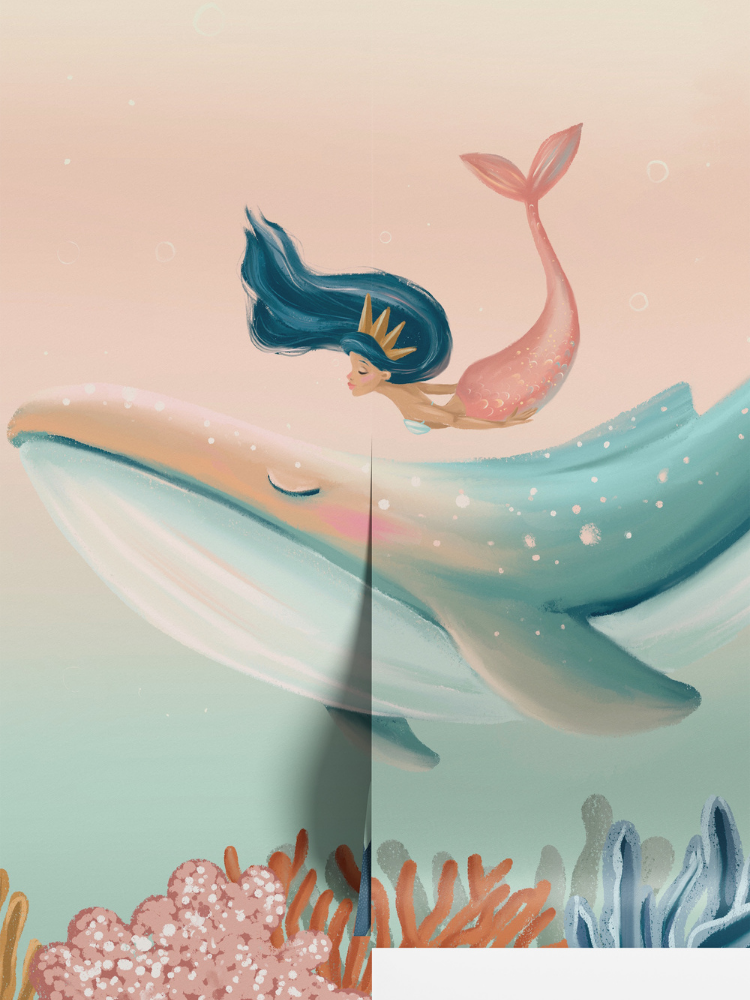 This mural wallpaper transforms any child's space into a whimsical sea adventure, with its beautifully illustrated mermaids, vibrant marine life, and soft flowing waves creating a storybook-like setting.