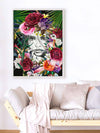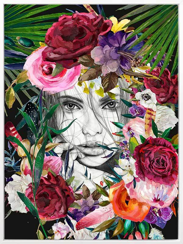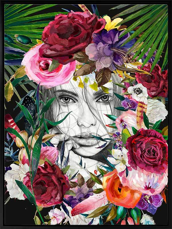 Sophia Summer Nights Canvas Art Print - Connect with nature's warm, magnetic energy with this stunning piece, featuring Sophia's intense gaze peeking through a burst of multicoloured flora. Perfect for bringing a refreshing vibrancy to your space with rosy reds, blush pinks, rich greens, bright orange, yellow, purple, and hints of soft white shades.