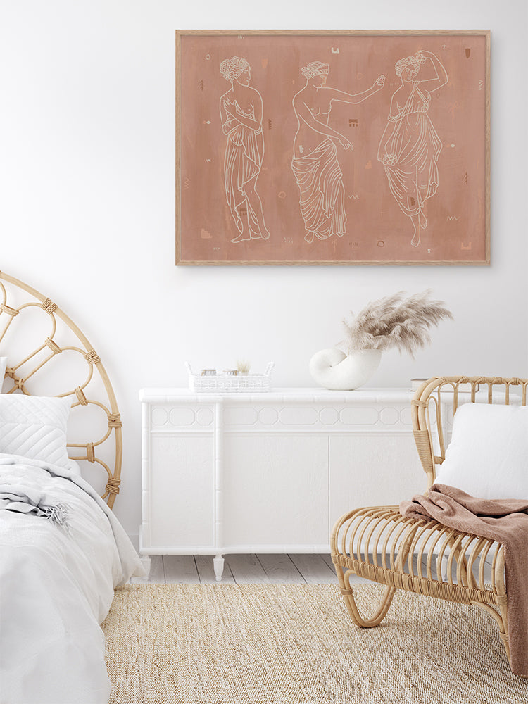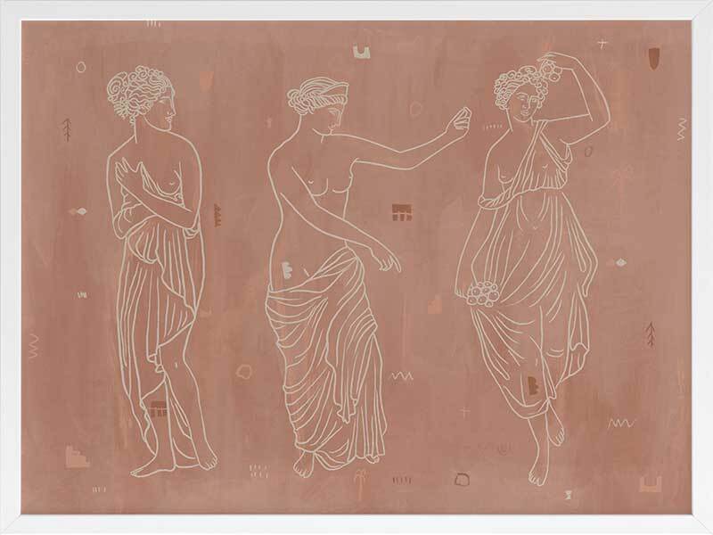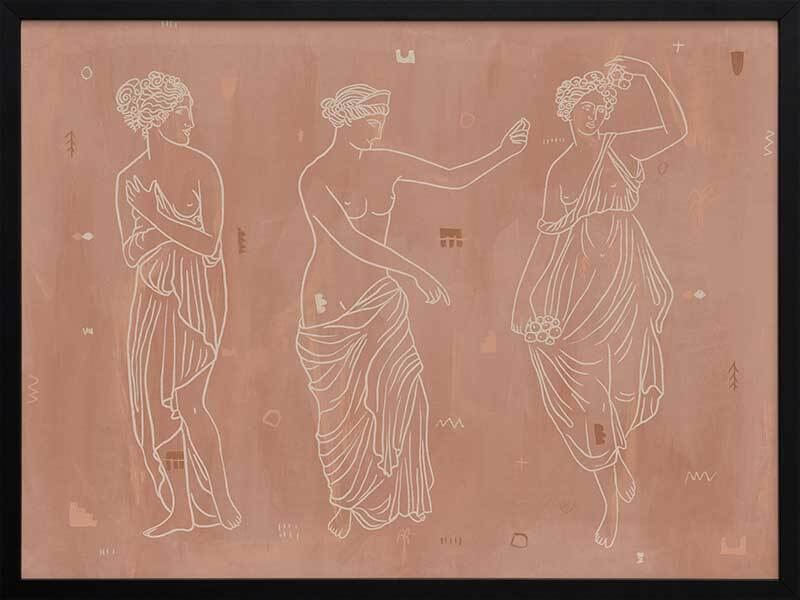 Sorority Sisters Dark Framed Art Print - Soft, whimsical and feminine, this ancient Greek-style illustration features three intricately line drawn women, draped with robes and linen. The colour palette is neutral and warm, with cream coloured lines painted a top a dark clay-toned textured background.