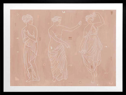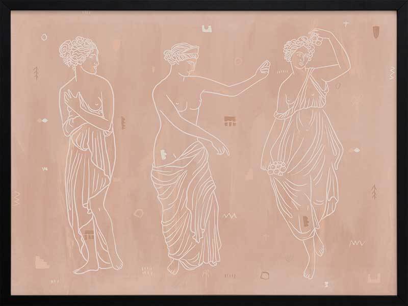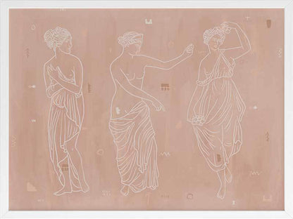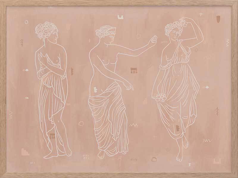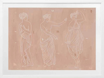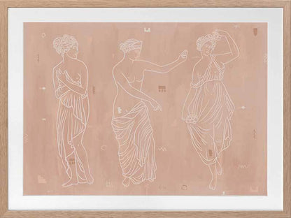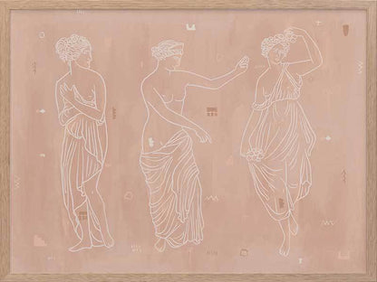 Sorority Sisters Light Framed Art Print - Soft, whimsical and feminine, this ancient Greek-style illustration features three intricately line drawn women, draped with robes and linen. The colour palette is neutral and warm, with cream coloured lines painted a top a light clay-toned textured background.
