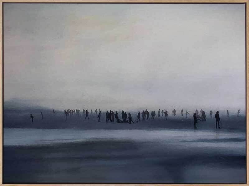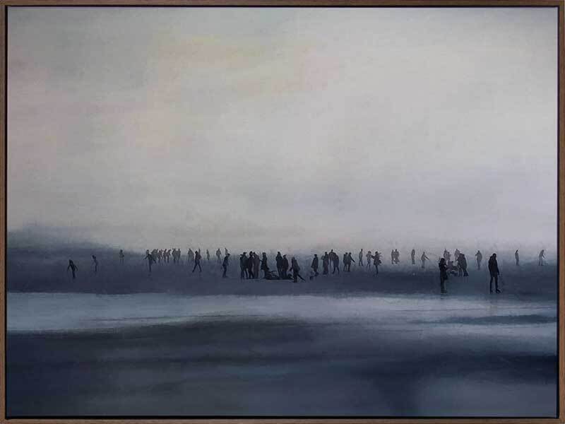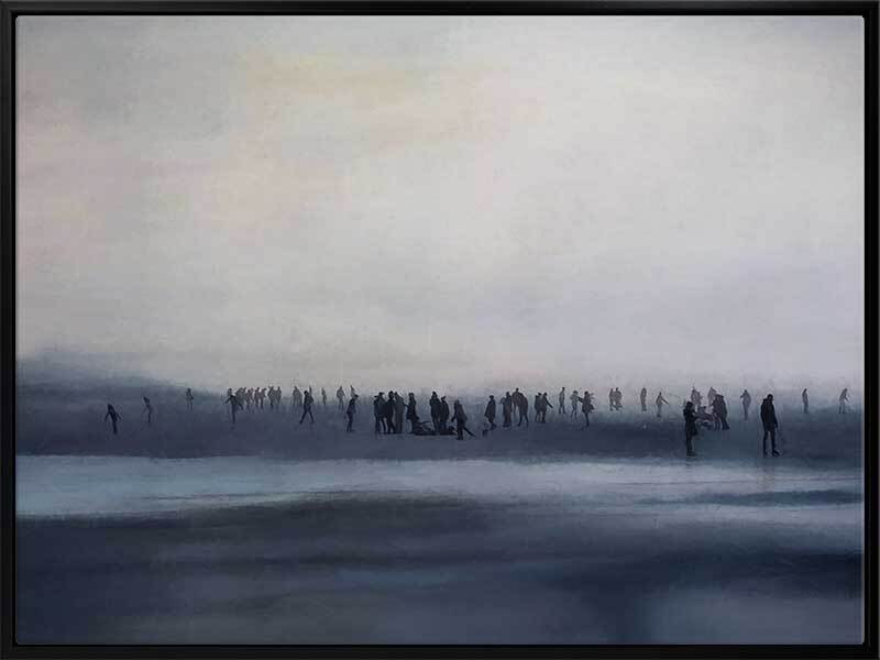 Sound of Silence Canvas Art Print: A moody art print of an oil-painted beachscape featuring a dark grey seashore and a silhouetted crowd of people. 2018 SPRING/SUMMER COLLECTION: REMINISCE
