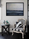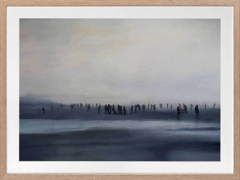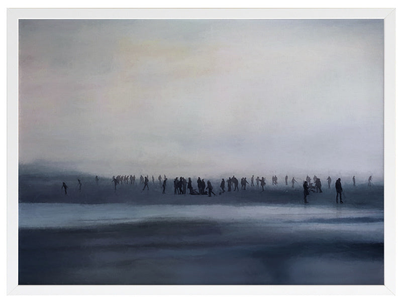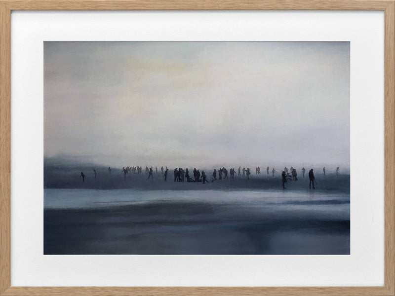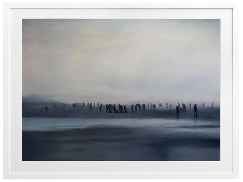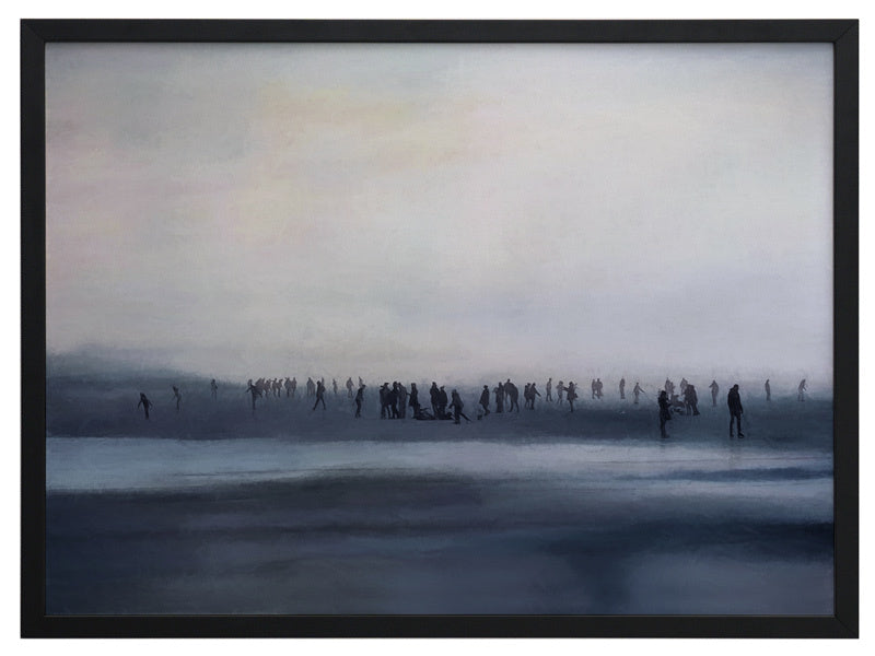 Sound of Silence Framed Print: A moody art print of an oil-painted beachscape featuring a dark grey seashore and a silhouetted crowd of people. 2018 SPRING/SUMMER COLLECTION: REMINISCE